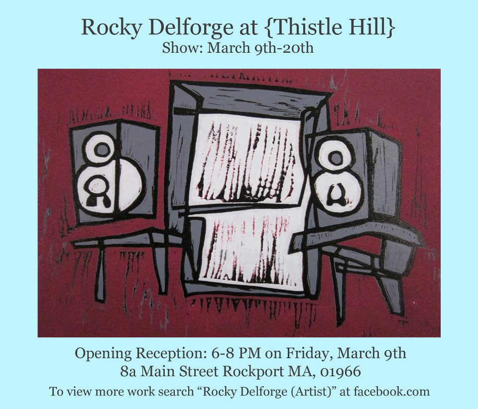 Spring has come to Rockport with one of the town’s first openings of the season! Rocky Delforge is a young Rockport printmaker and artist who is doing some great contemporary work. Yesterday a few of us in town got a preview of his new show and were especially impressed by his massive hand-printed piece depicting downtown Rockport – you MUST see this piece!