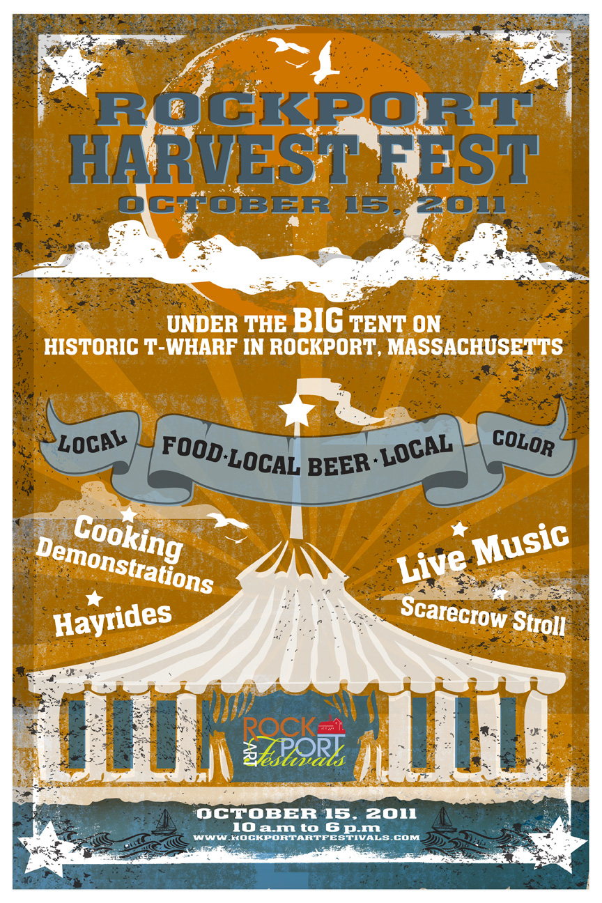 Many thanks to Darren Mason of Merge3 Creative for the very cool poster he created for this year’s Rockport HarvestFest. It sums up the fun: local food, local beer, local color. HarvestFest features the best of New England food producers, a very cool Scarecrow display throughout town, hayrides, a screening of the movie The Vanishing of the Bees, fantastic live music and more! Check it the Schedule of Events through this link: www.rockportartfestivals.com