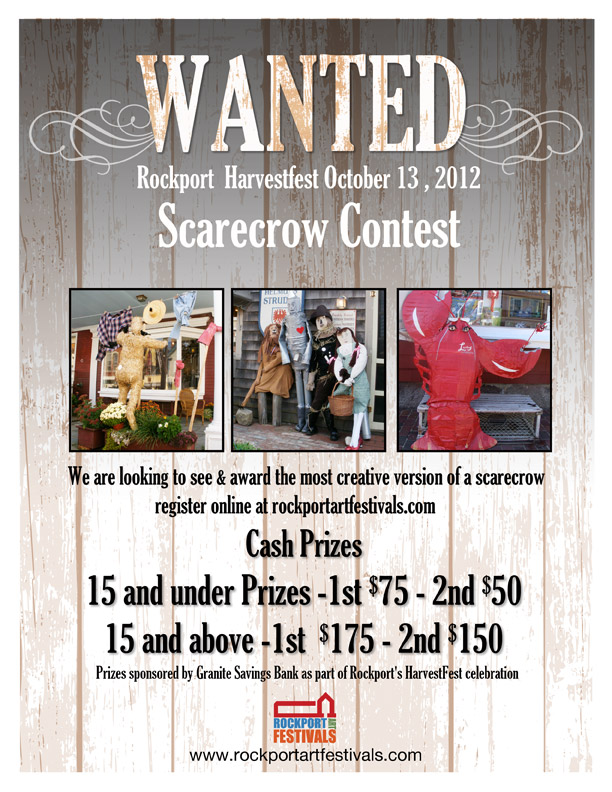 Rockport’s HarvestFest is coming up on Saturday and THIS year Granite Savings Bank has generously furnished some cash prizes for the winning scarecrows in our Scarecrow Stroll Contest. $175 and $150 for first and second place in the 15 & Older Category. Yes, that’s right: $175 and $150! You could do a lot with that money. Teams are encouraged to enter, with nonprofits especially encouraged to enter to raise funds for your organization. The possibilities are endless! There is also an “Under 15” category for groups or individuals with $75 and $50 as the first and second place prizes. Don’t be shy! Make a scarecrow! You can pre-register online (Click HERE and scroll down when you get to the page for online registration) or just show up with your ‘Crow on Saturday, October 13th at 9 o’clock in the Scarecrow Stroll Headquarters in Dock Square!