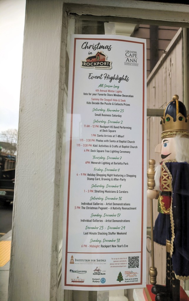 December 2nd, 2023 is busy all over Cape Ann! Activities in Rockport are scheduled all day (from 11-4) leading up to Rockport’s Tree Lighting Celebration in Dock Square. Literary Cape Ann’s 2023 Holiday Book & Author Fair at Brackett’s, next to Brother’s Brew, will be bustling 12-3.