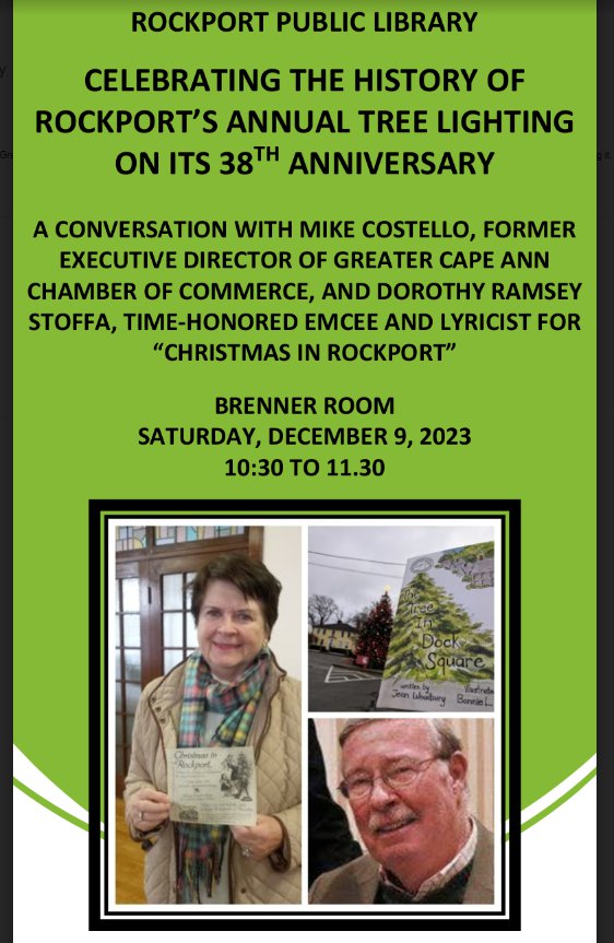 Rockport Public Library Sat. Dec 9th 10:30-11:30: Celebrating the History of Rockport’s Annual Tree Lighting on its 38th Anniversary. A conversation with Mike Costello, former Executive Director of Greater Cape Ann Chamber of Commerce and Dorothy Ramsey Stoffa, Time Honored Emcee and Lyricist for “Christmas in Rockport” with Jean Woodbury, author The Tree in Dock Square.