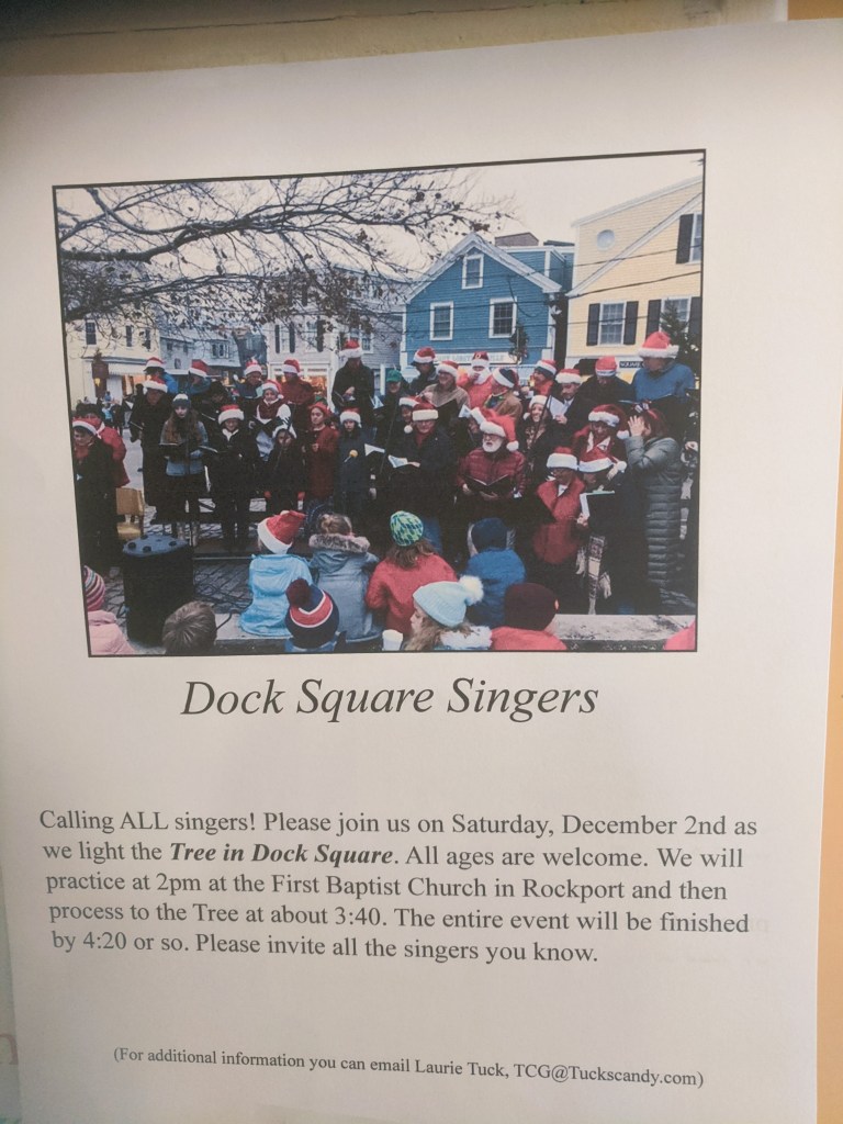 Dock Square singers for Rockport’s annual tree lighting meet up to practice at 2pm. See below.