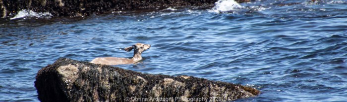 As I got there was told there were four deer swimming from Kettle Island and got caught up in the current and were tired. Three were able to swim towards Magnolia Beach, this poor one, people thought she may be the mom, was stuck in the rocks with the current. The Environmental Police, Gloucester Police and Animal Control were trying to help. The Environmental police officer stated that because the tide was coming in hopefully she could get herself back on Shore. Also I must add, there were three young boys on the rocks named Theo, Kellen and Owen who were so kind and very helpful to the Environmental police. Hope this deer is ok.