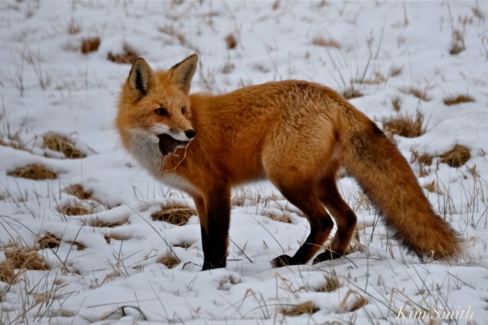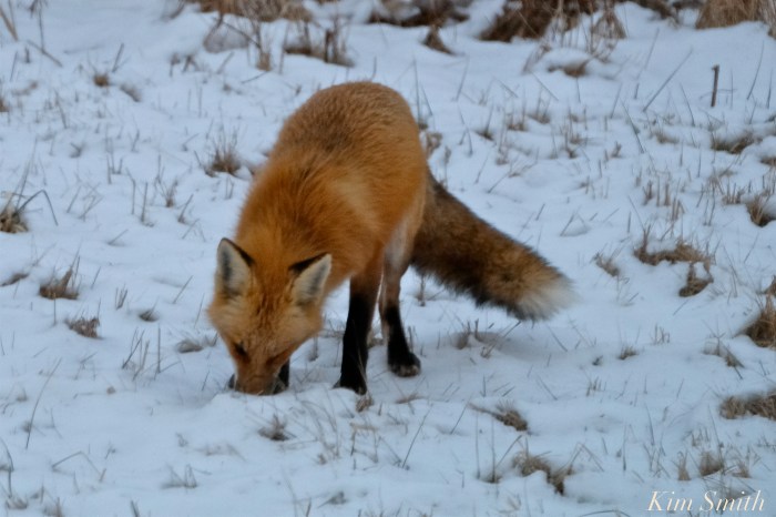 Driving along the Great Marsh at dawn, off in the distance a Red Fox caught my eye. I quickly reversed direction and was able to take a few snapshots. The Fox was vigorously digging in the snow and when he looked up, a small furry creature was clenched between its jaws.