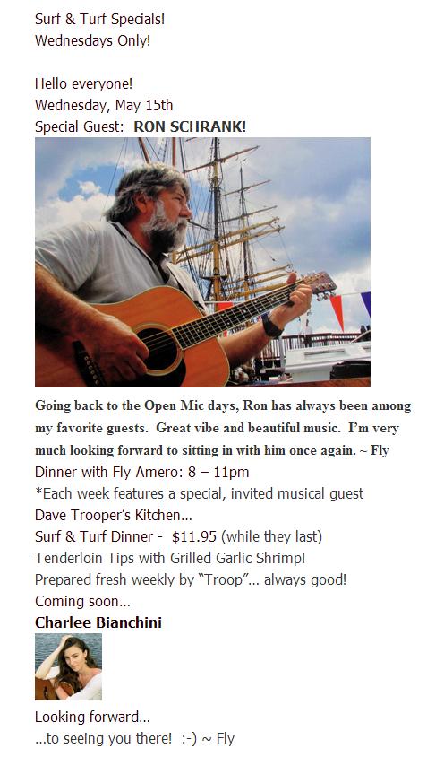 has graciously taken on last-minute hosting duties this week as I travel once again to points west. Sure to be an evening of feel-good music and great fun. Drop by and say hello! ~ Fly