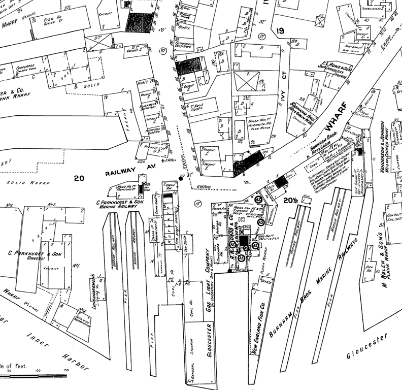joey – here’s a piece from the 1909 sanborn insurance map that shows where the parkhurst and burnham railways were in relation to each other. few years earlier than the pilot boat pix, but the layout of the inner harbor didn’t change that much until urban renewal. fyi, around 2005, some internet angel posted a complete set of the cape ann sanborn maps, from 1885-1917 in pdf format. i downloaded them and have been using them ever since. gave copies to the gloucester archives and sfl, and converted them to grayscale tifs for my own research purposes. museum has these on board as well as the original full color hand-annotated atlases (that weigh about 50 pounds each!) you want to know how this place has changed over the years? never mind the pretty pictures, go to the maps. they tell the story like nothing else can.