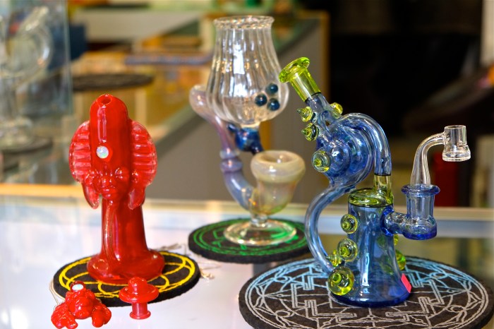 Thanks so much to Mike Forgette for taking the time to show me around the shop he co-owns with Jonathan Moody, High Tide Glass Co. The store was bustling and is cockablock full of cannabis related products including one-of-a-kind handblown art glass pipes, T-shirts, tinctures, salves, and art by local artists.