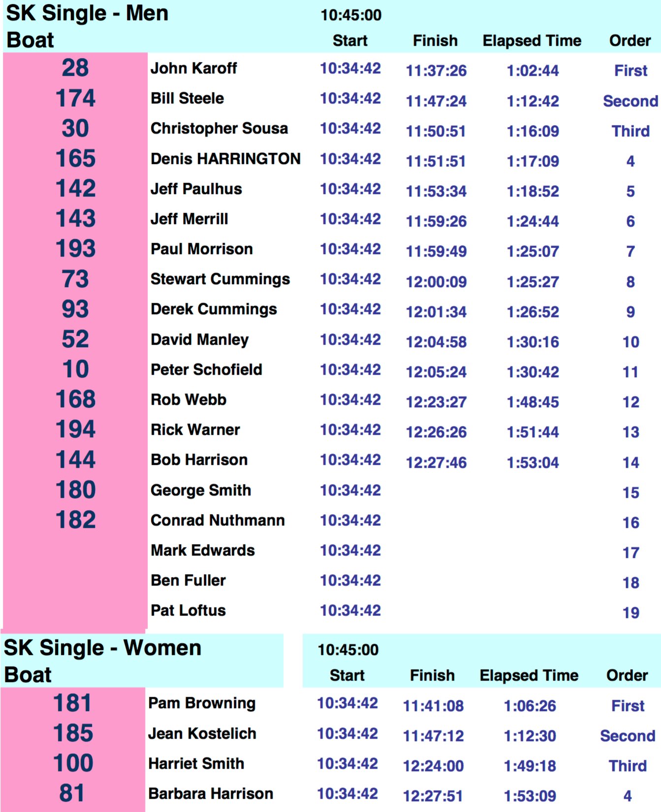 But on to the Sea Kayaks. John Karoff who I think broke 60 minutes last year wins again. Looks and talks like a totally normal person, a tad skinny but he wins this every year. Before the race Rubber Duck checked the percent body fat of all sea kayak contestants both male and female. None measured higher than 7%. This is when rubber duck looks at who is paddling her boat and does a major SMH and FFS. But check out these numbers. These are preliminary but I’m taking them to the bank and signing up for the Blackburn tonight.