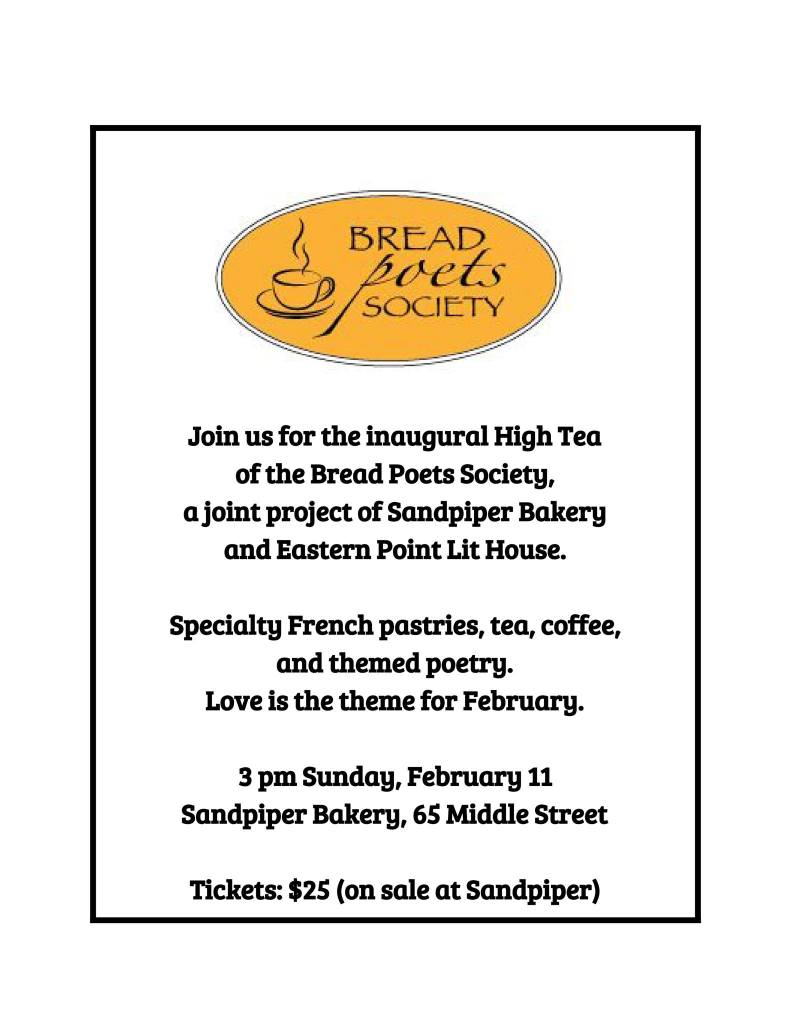 February 2018 – What’s Your Favorite Love Poem? Lit House Philip Storey will lead. Specialty French pastries, tea, coffee and themed poetry. 3pm Sunday, February 11, 2018. Sandpiper Bakery, 65 Middle Street, Gloucester, MA. $25