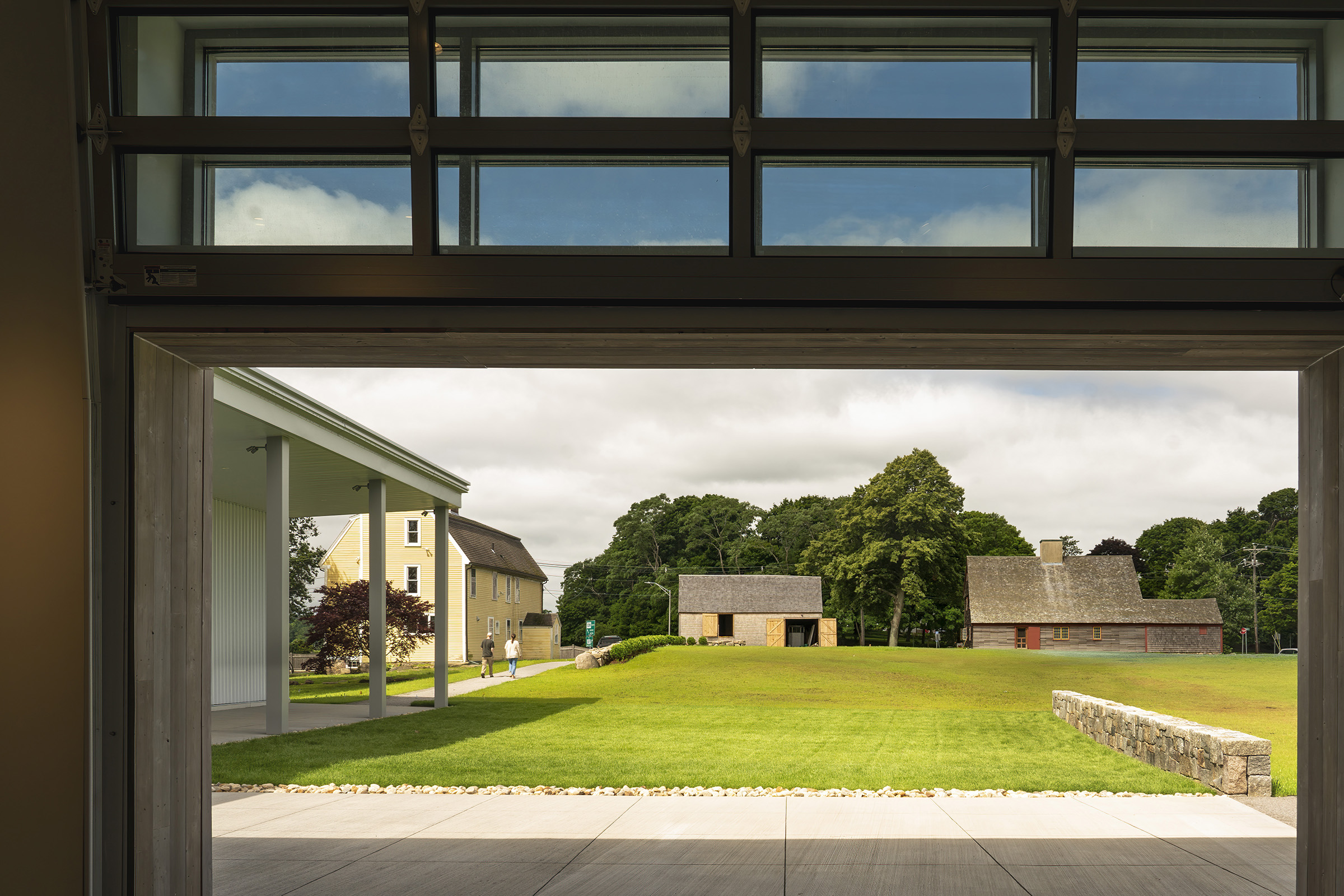 photo caption: Cape Ann Museum Green campus with a view from the new12,000 square foot Janet & William Ellery James Center out to the campus which includes three historic buildings (from right to left) the White Ellery House (1710), an adjacent Barn (c. 1740), and the Babson-Alling House (c.1740), all located on the site at the intersection of Washington and Poplar Streets in Gloucester. Photo by Steve Rosenthal, 2020.