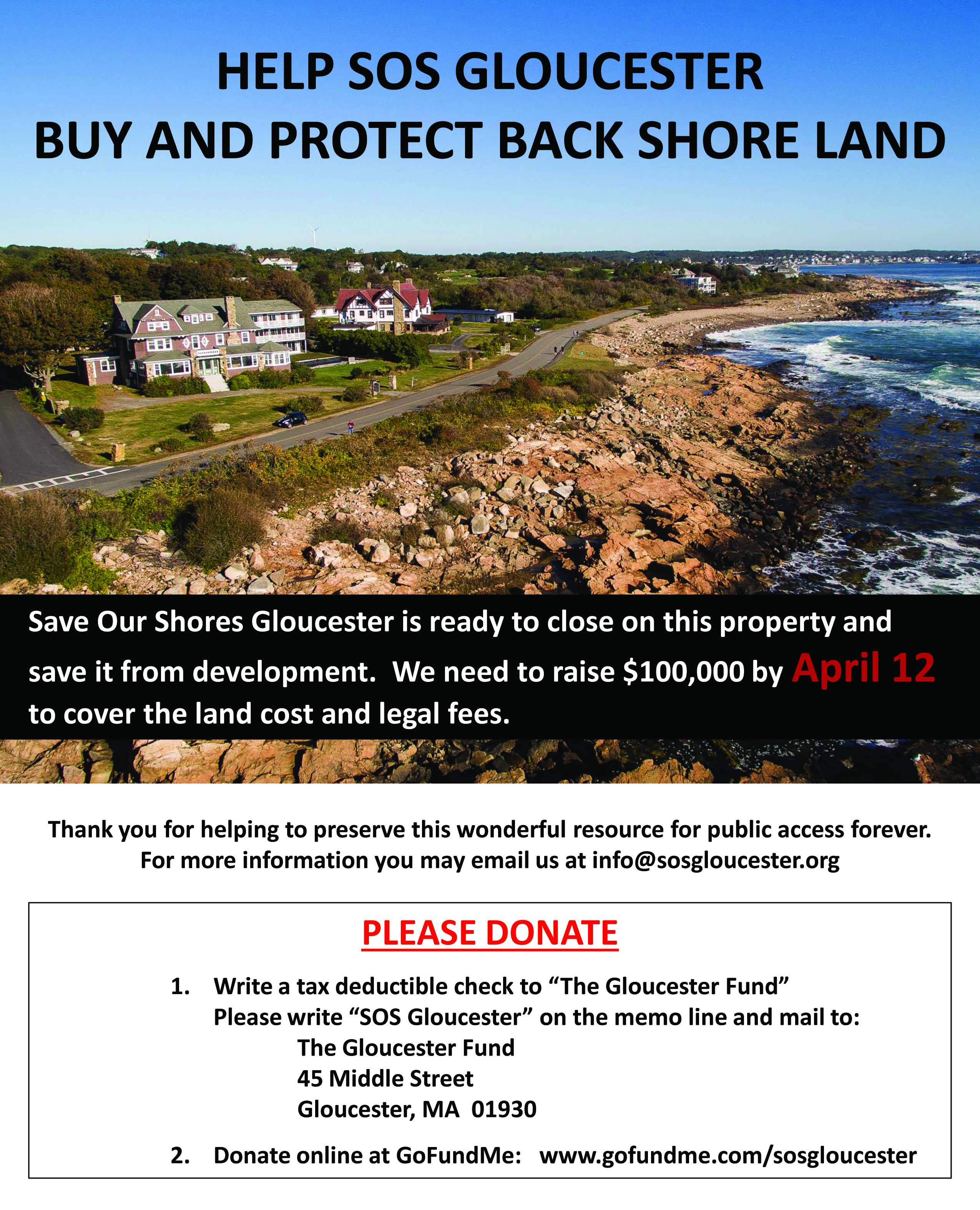 Donate now and own a piece of the Back Shore Tax-deductible contributions can be sent to the Gloucester Fund, 45 Middle St., Gloucester MA 01930. Please add SOSG to the memo line. Donations may also be made through GoFundMe at https://www.gofundme.com/sosgloucester.