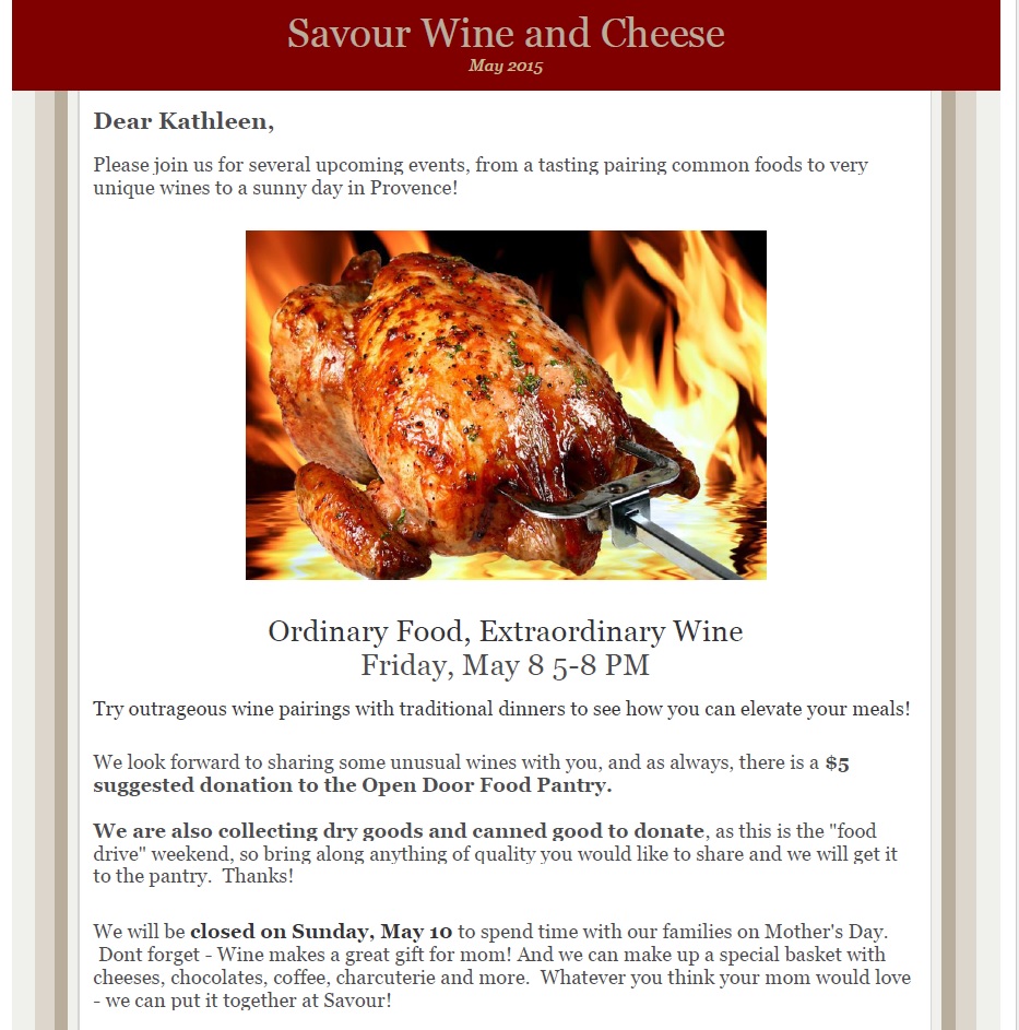 First of all the wine selection is extensive and wonderful. In addition, the cheeses that are available are incredible. It is also a perfect destination for a gift for a friend, guest, or dinner host. Each holiday season I have shopped for at least two people on my list at Savour.