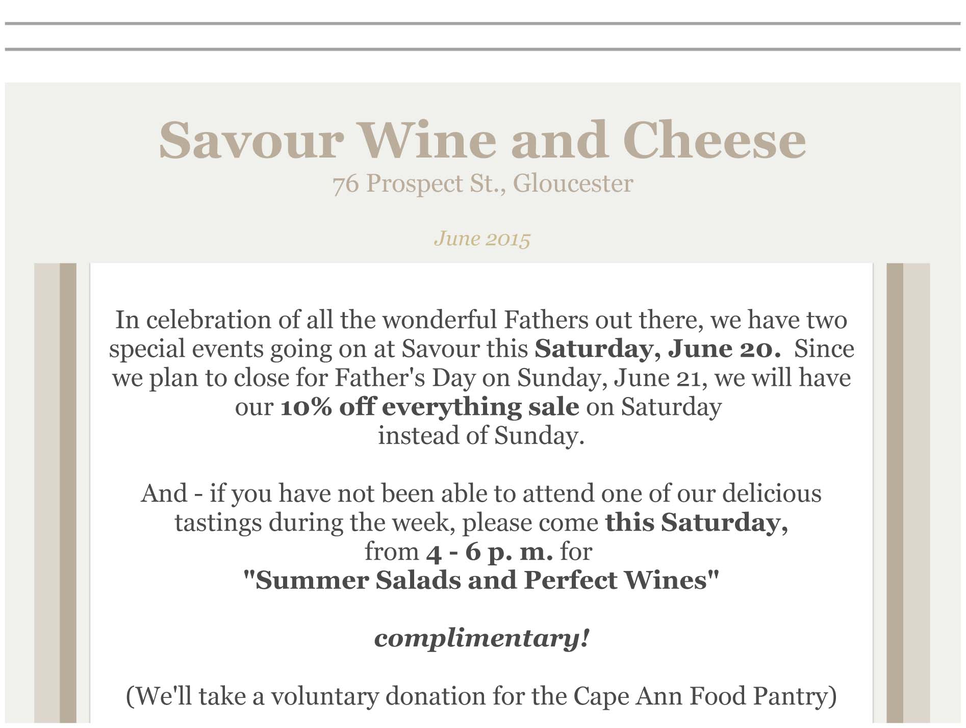 Saturday Father’s Day Sale and Wine Tasting at Savour Wine and Cheese