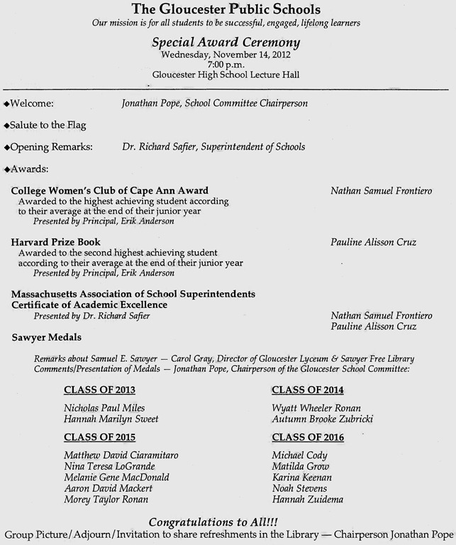 “In June of 1912, the first Sawyer medals were awarded to the boy and girl in each class who was outstanding in scholarship and effort. These medals were paid for from the interest of a fund established by the will of Samuel E. Sawyer, to whose generosity Gloucester is indebted for many things, including the public library building.”