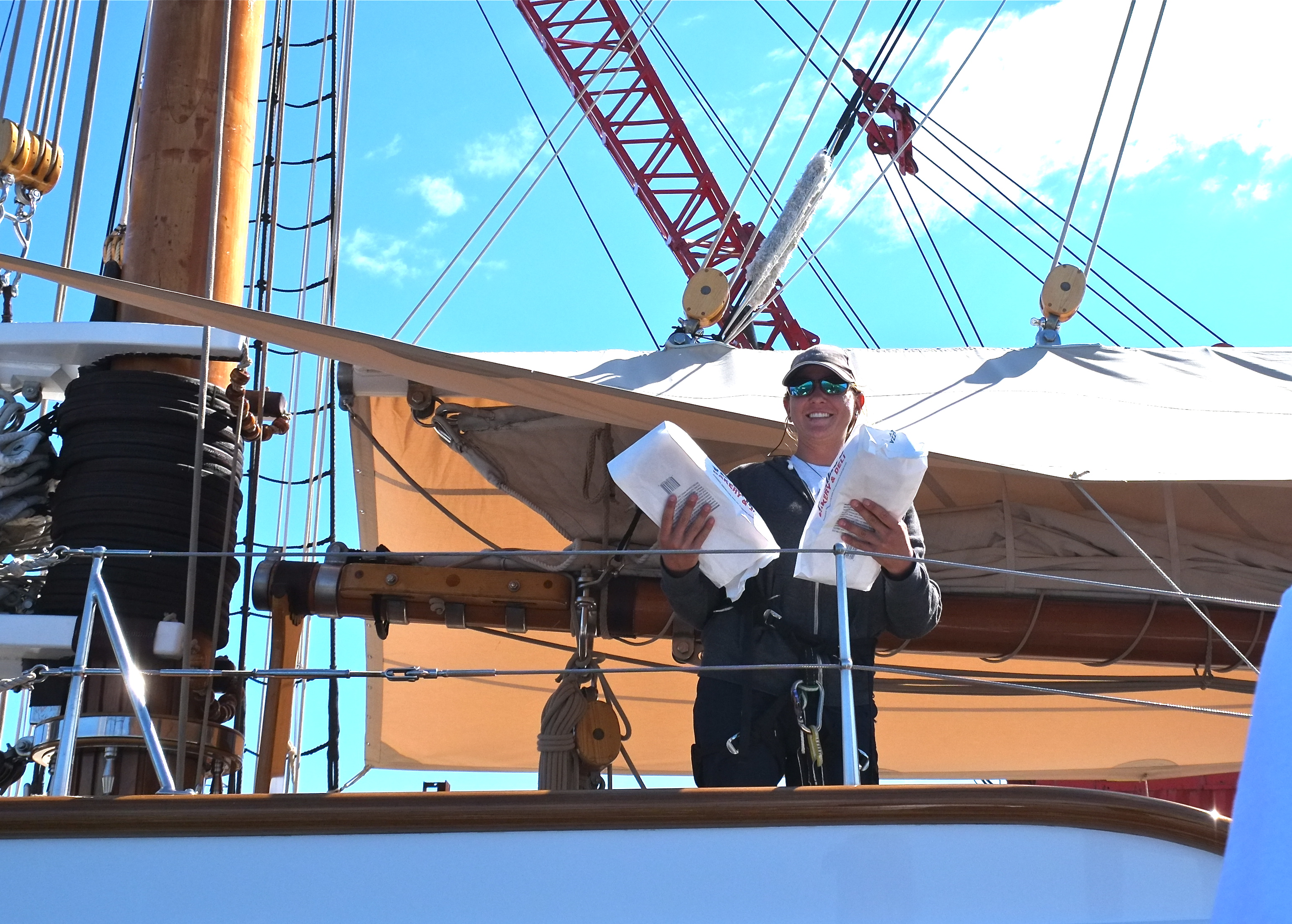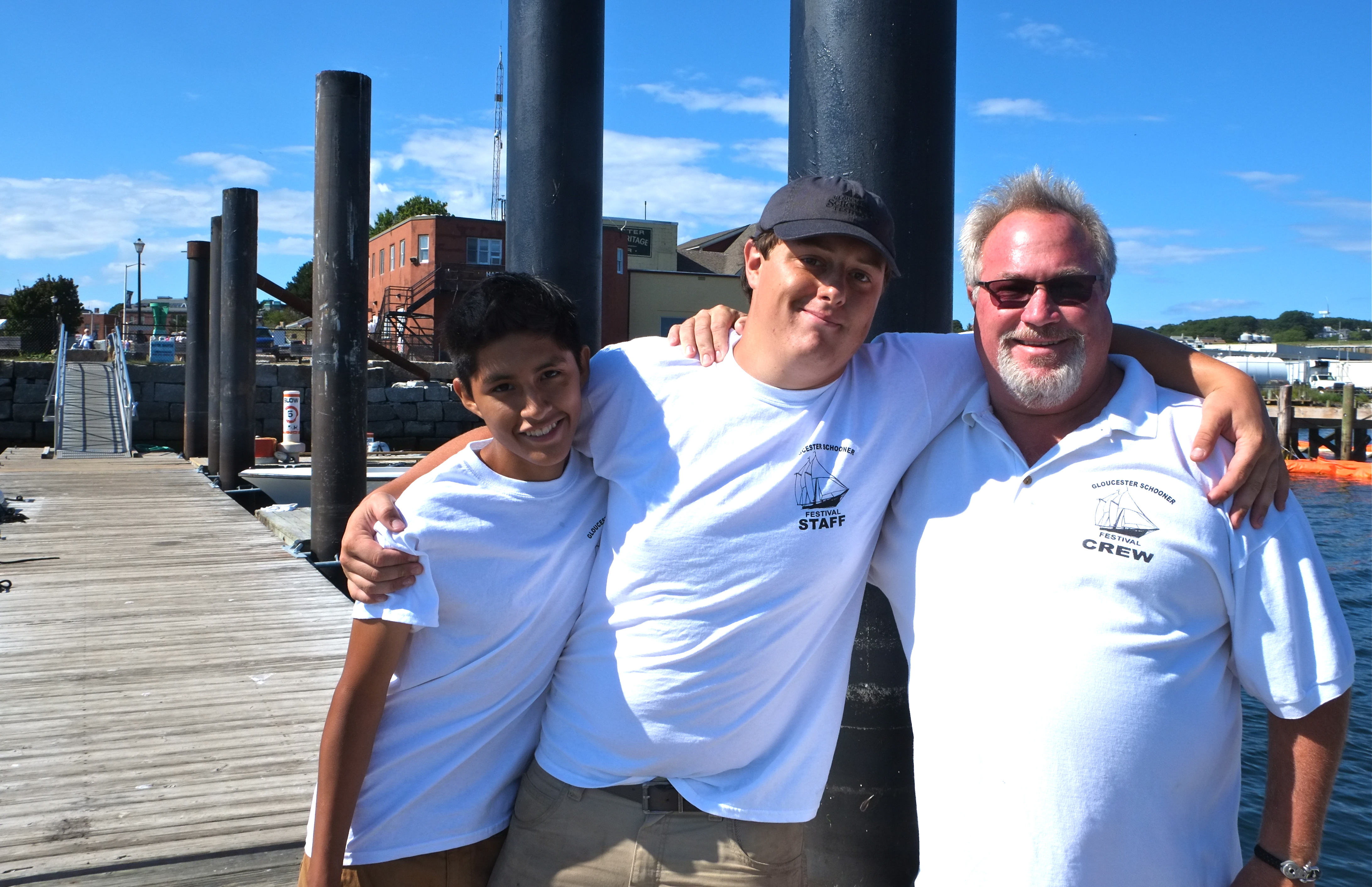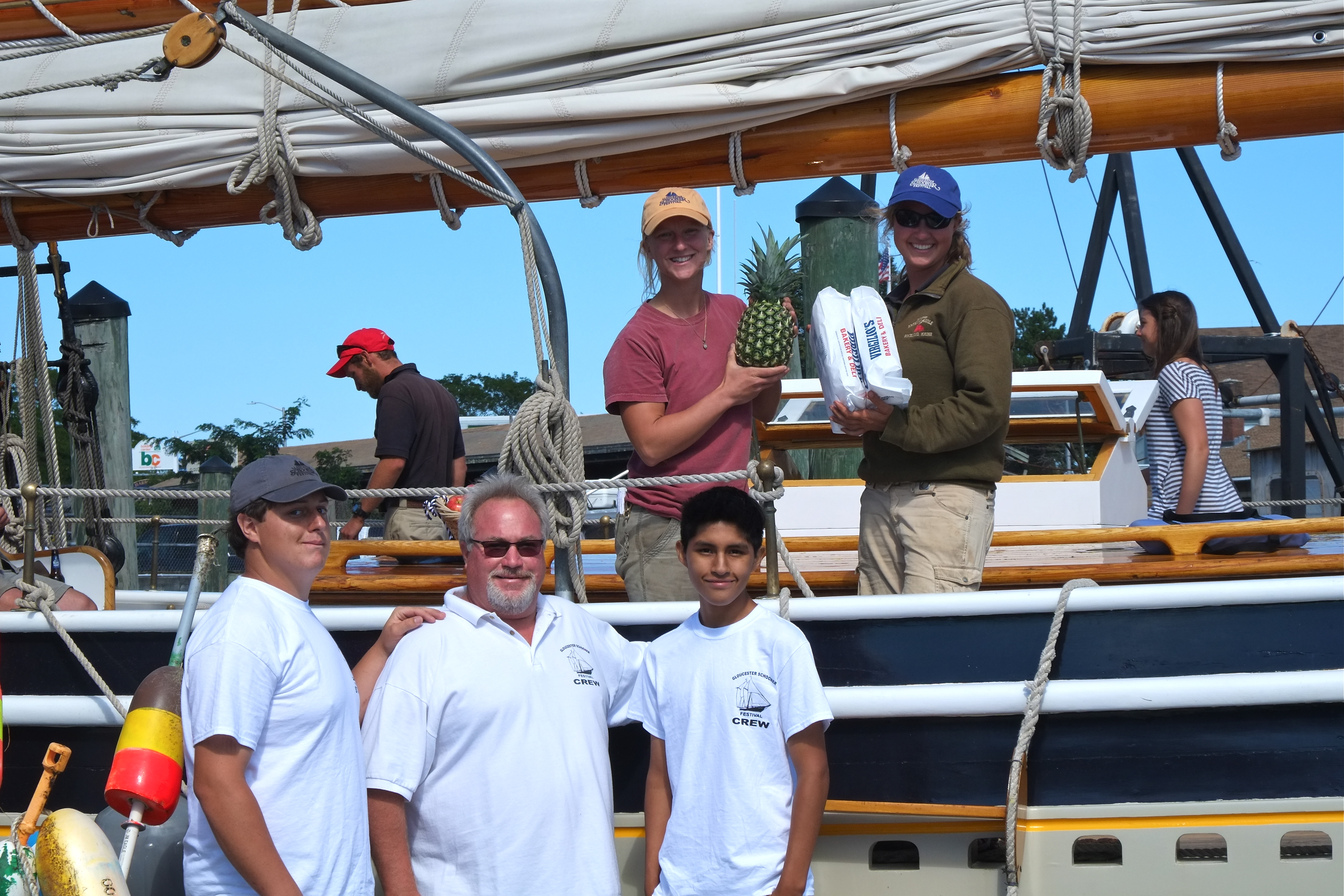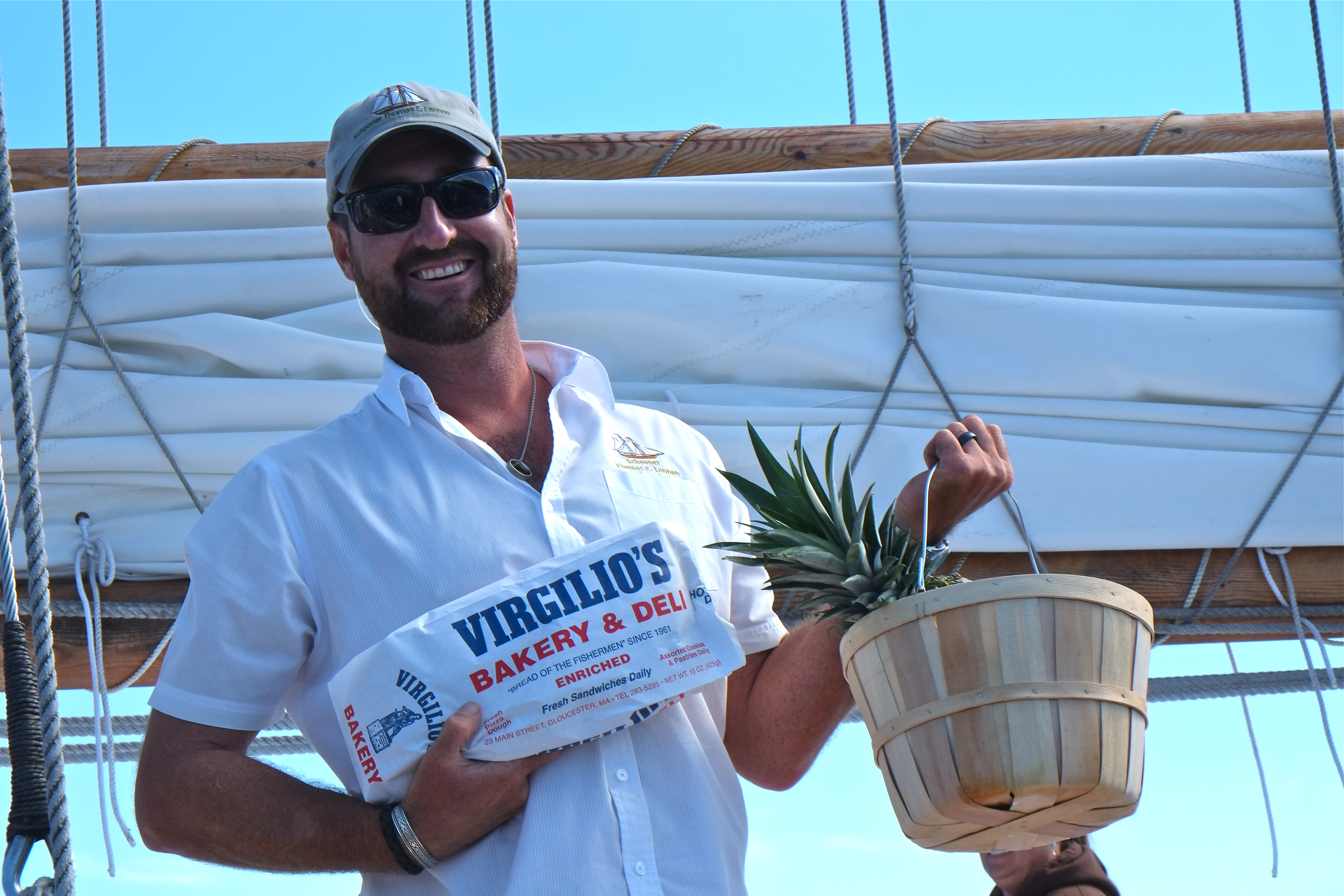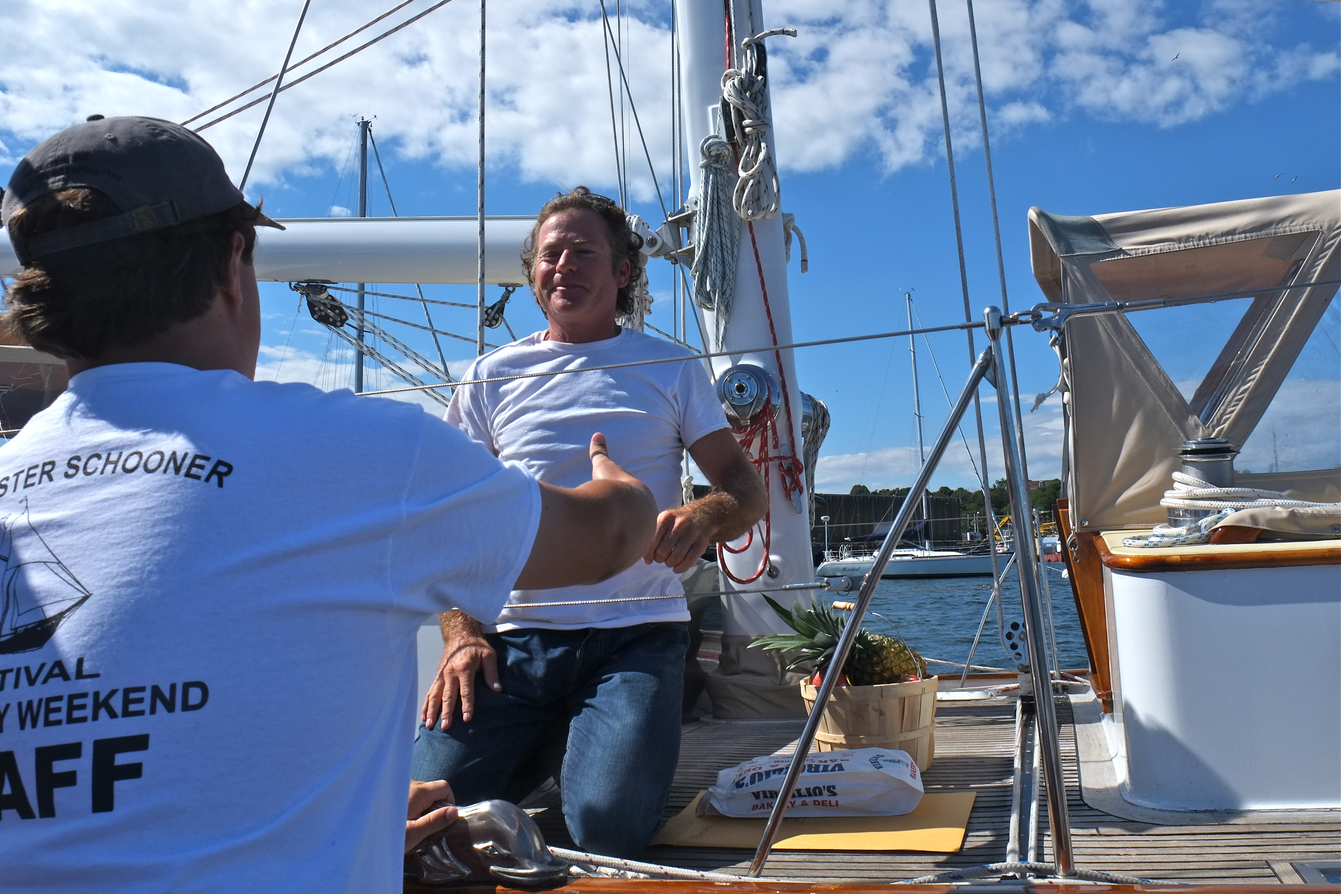 What a treat to tag along with Gloucester’s own Schooner Festival welcoming committee Brett Ramsey and his sons Max and Nick. Each year Brett purchases and assembles baskets of fresh fruit. Along with loaves of yummy bread still warm from Virgilio’s ovens (donated by Joe Virgilio), Brett and his family welcome each and every participating schooner. You could tell that the recipients were really grateful and touched by the gesture.