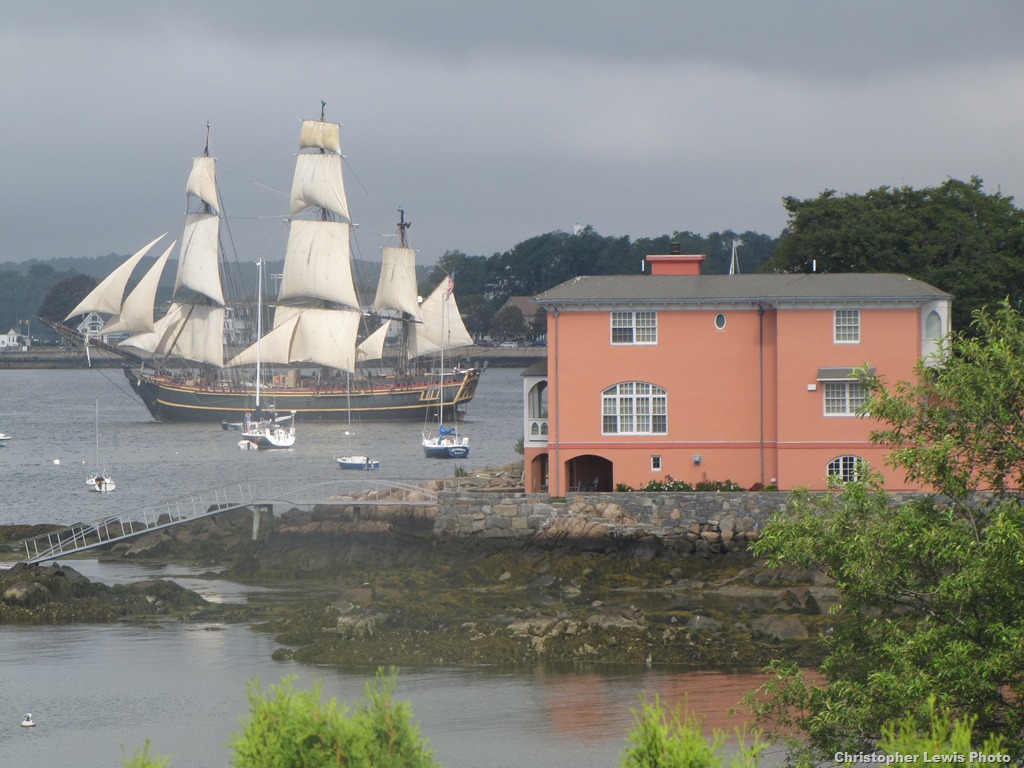 You may like these two photos of HMS Bounty leaving Gloucester on Monday morning. They show how large this schooner is. In the first photo you can compare the Bounty to the "Tuscan House" on Rocky Neck. The second photo compares Bounty with a foreground of small boats and a background of the Boulevard – a truly remarkable sight.
