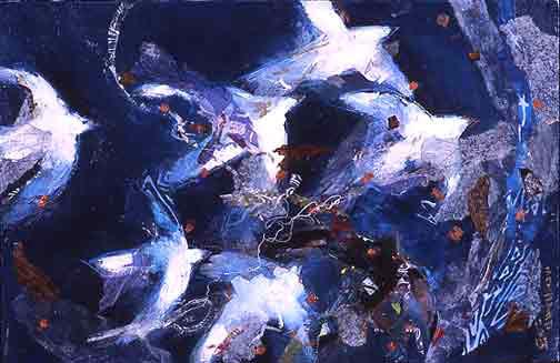 “Night Flight” c. Sue Memhard, acrylic & collage on wood