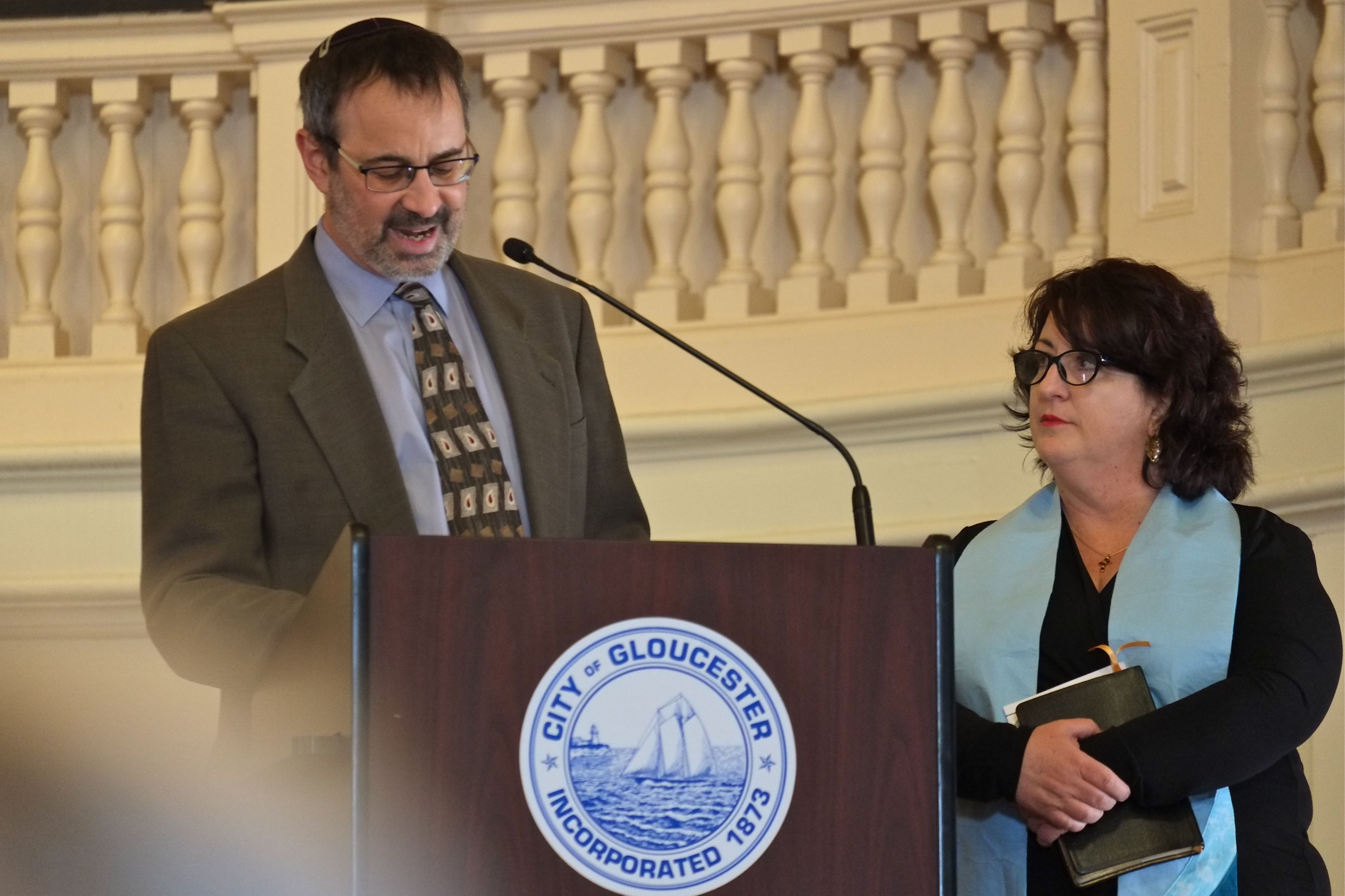 One couldn’t help but be inspired by the good words and deeds of our city’s finest leaders at today’s inauguration ceremony. Cape Ann Museum director Rhonda Faloon gave a warm welcome followed by Gordon Baird’s pitch perfect rendition of “God Bless America.” Young community members were represented by the GHS Docksiders, the Presentation of Colors by GHS Junior ROTC, and the Mayor’s grandchildren and niece AJ, Bianca, and Lia led the audience in the Pledge of Allegiance. Alexandra Grace sang a beautiful rendition of the “National Anthem.”