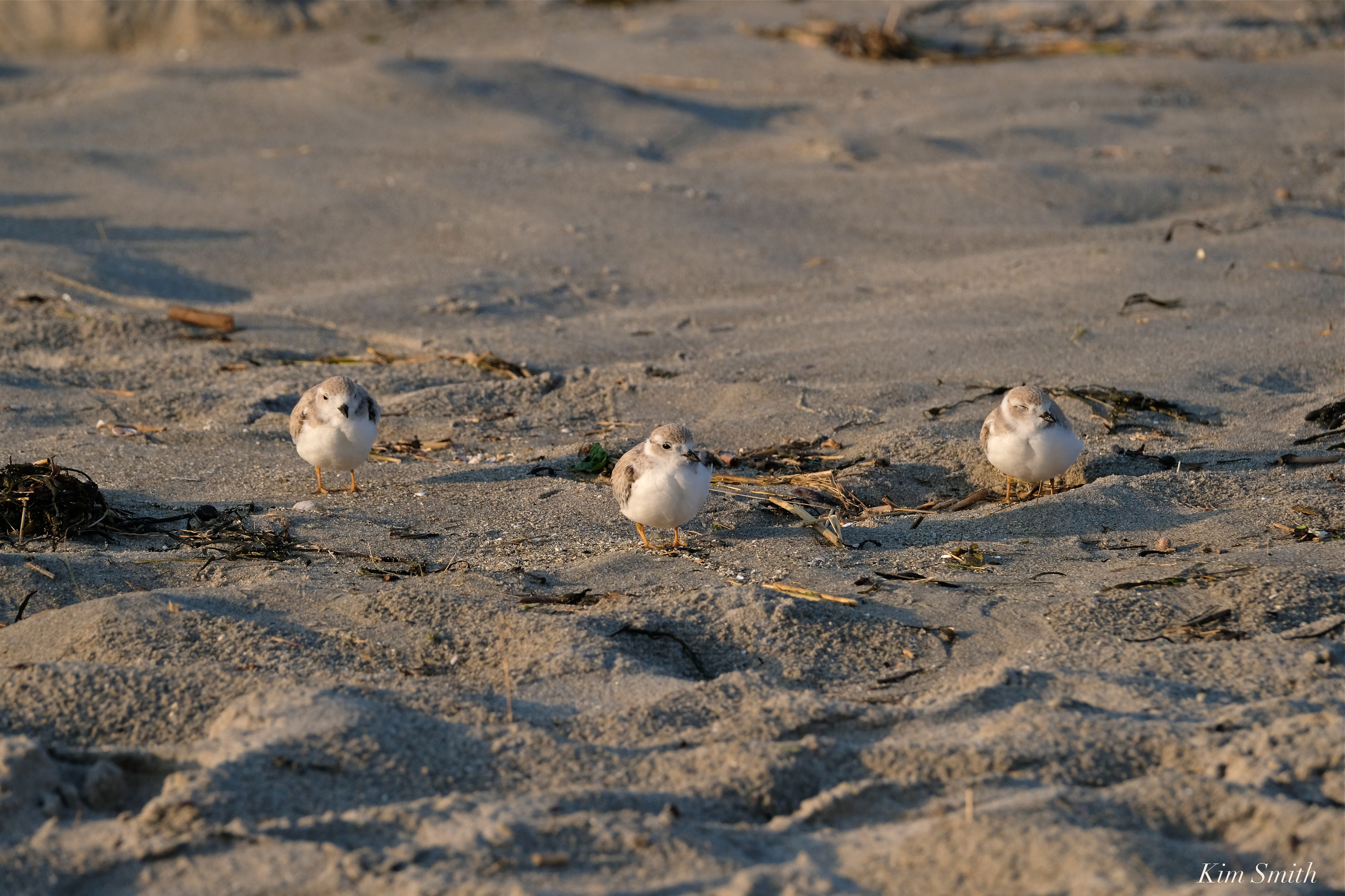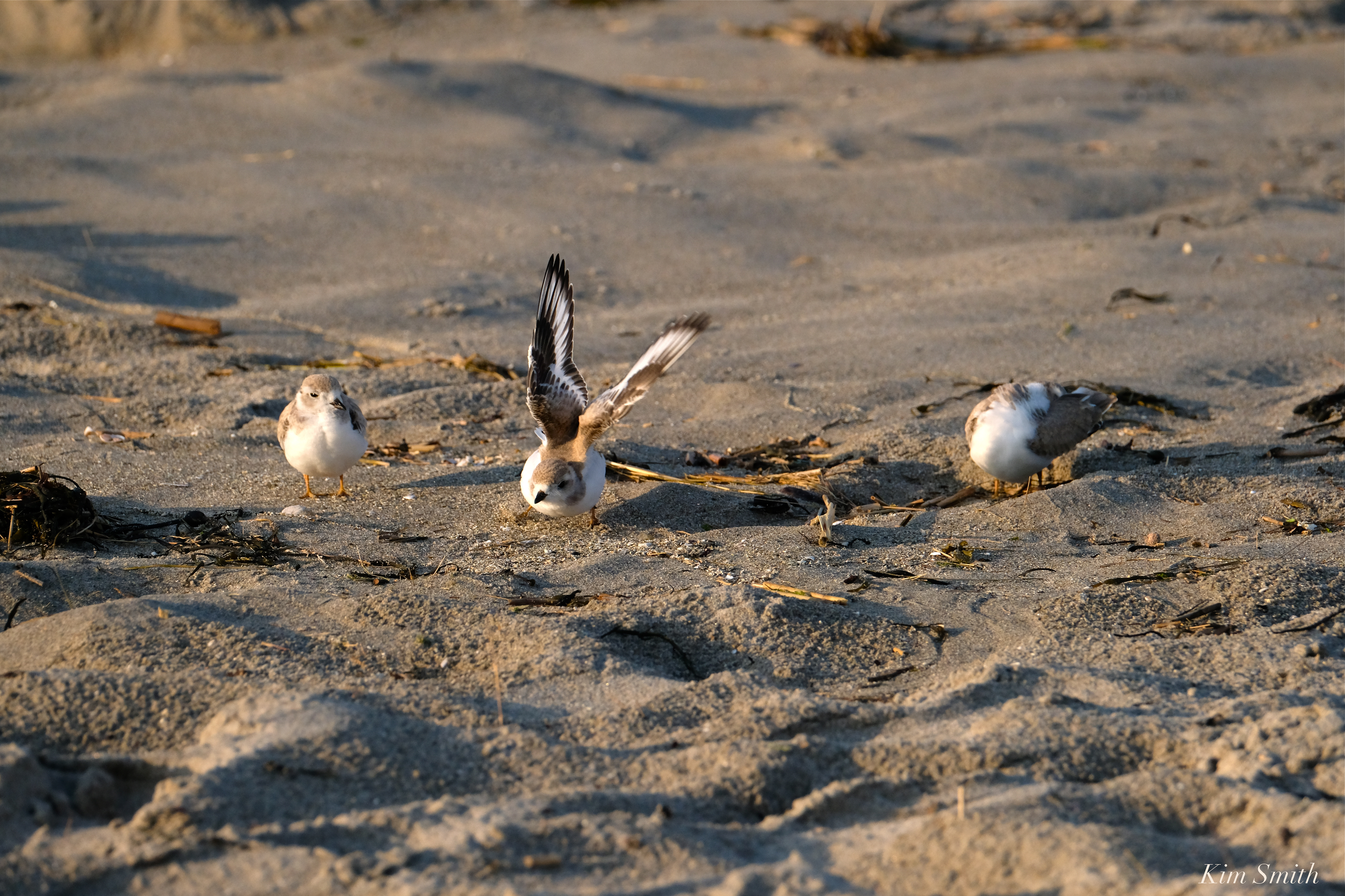 The photos are from July Fourth weekend, at 35 and 36 days old. These past several mornings at daybreak I find the three fledglings, Mom, and Dad foraging and preening together on the tidal flats and wrack line in front of the enclosed area. They move back within the roping when the tractor comes through, preen for a bit, head back down to the tidal flats, or fly off to the creek. The family is continuing to stay together, but are dispersed during the day when feeding. There is a wide variety of insects and small sea creatures to forage from at Good Harbor Beach as the PiPls plump up for their southward migration.