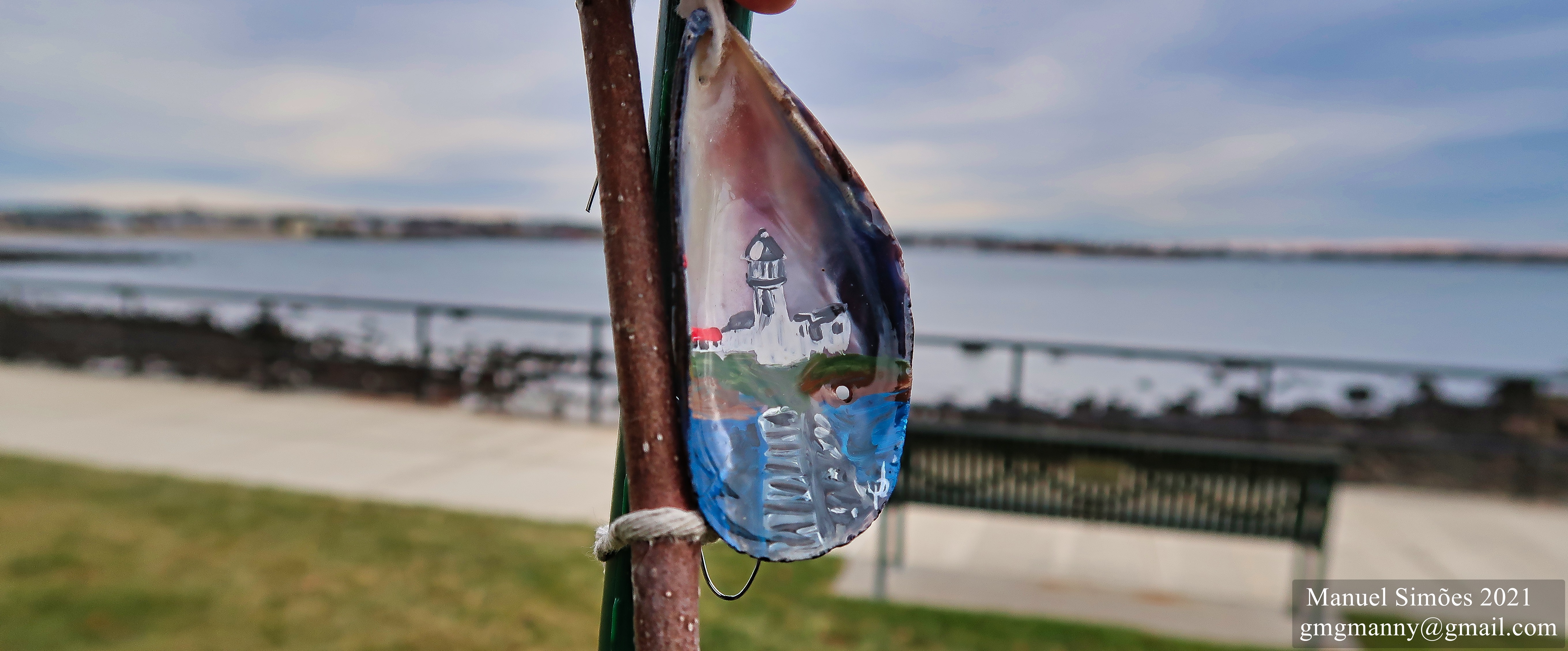 Shell Art on Stacy Boulevard. One day it’s hanging on a tree, the next day it disappears. Seagulls must also decorate for the Holidays.