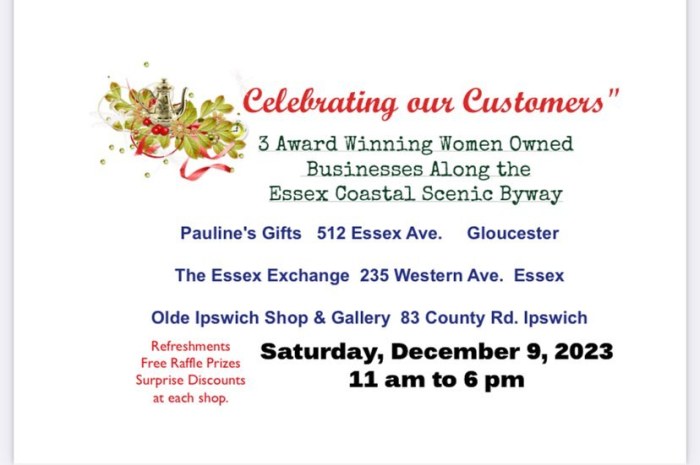 The Cave, Pop Gallery, Cape Ann Olive Store which are on Main Street and Pauline’s Gifts at 512 Essex Ave, Gloucester, MA.