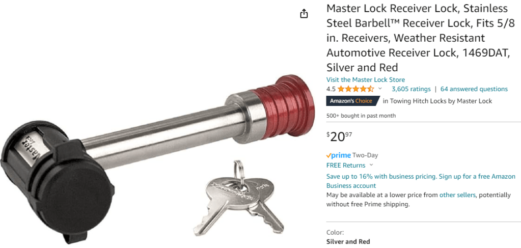 Master Lock Receiver Lock, Stainless Steel Barbell™ Receiver Lock, Fits 5/8 in. Receivers, Weather Resistant Automotive Receiver Lock, 1469DAT, Silver and Red