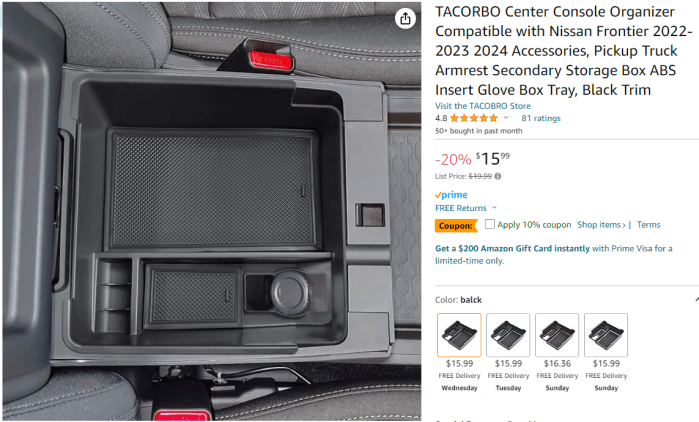 TACORBO Center Console Organizer Compatible with Nissan Frontier 2022-2023 2024 Accessories, Pickup Truck Armrest Secondary Storage Box ABS Insert Glove Box Tray, Black Trim