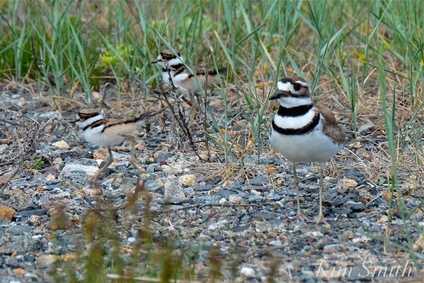 If you encounter the Kildeer family and would like to take a photo, or simply observe these adorable babies on-the-go, my advice is to stand quietly and don’t chase after them. Running after the chicks will put the parents into panic mode and they may lose sight of the other siblings. As the chicks mature, they will spend less time in the parking lot, and more time in the marsh and at the tidal river edge. Kildeer adults, and even the chicks, are actually good swimmers. Last year the Kildeer family crossed the tidal river and spent the second half of the season on the opposite side of the marsh.