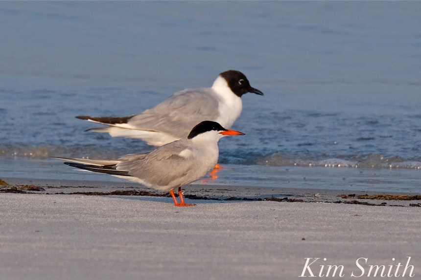 Compare Common Tern in the foreground to Bonaparte’s Gull in the background. Both have red-orange legs and feet and both are black-headed. The easiest way to differentiate when on the beach is the Common Tern’s bill is orange; the Bonaparte’s Gull’s bill is black.