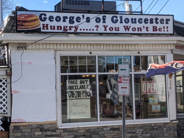 George’s Coffee Shop of Gloucester corner of Washington and Centennial sign- Take Out Available (978)281-1910