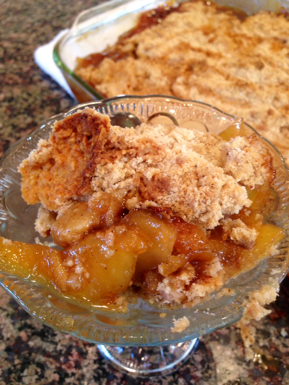 Caramel Apple CrispA few years ago I created and posted this recipe…It’s become a fall favorite in our home…If you love caramel apples, and apple crisp, this is a must try recipe! I can’t waitĀ to serve it for dessert tonight with a scoop ofĀ Vanilla Bean Gelato using apples from our dear friends Jeremy and Tanya Frost’s fruitful back yard Apple Tree! I have never seen a tree bearing 2 different verities of apples growing from a single tree trunk! Both the red Gala and yellow Golden Delicious tasted delicious! Jeremy held the ladder for me while I hand picked and filled 2 large bags last Saturday! The Frost’s apple tree was a magnificent sight in their yeard this year! Jeremy reported that this years harvest is the best in the past several years, and that this was the first year it beared two types of apples. Thank you for sharing your special tree with me, I’m having a great time in the kitchen whipping up our fall favorite confections and have also created a few new recipes that have been big hits!Ā