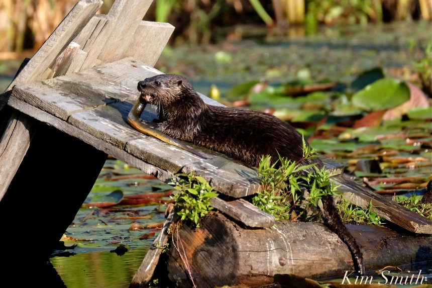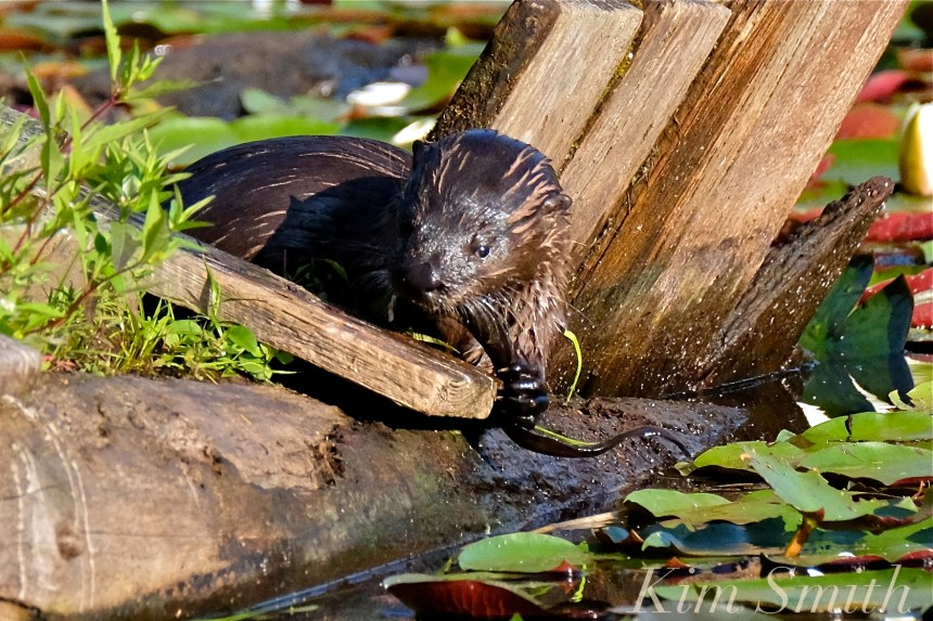 This summer over in West Gloucester there appeared to be two Otter families, one mama with three pups and another mama with four pups. After watching the romp of Otters eat tadpoles and frogs early in the summer, by midsummer they had graduated to American Eels. I at first could not figure out what they were doing skirmishing around in the tall grass at the pond bank. Compared to diving and resurfacing with a mouthful of frog, this was entirely new behavior. There was much excited chortling when one of the pups caught an eel, which then seemed to set off a chain of eel ambushing and eating. One morning I had the great fun of observing three otter siblings chomping down on an otterly delicious breakfast!