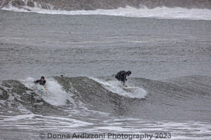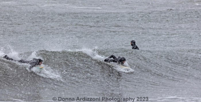 Surfers on Magnolia Beach during the Nor’easter on Tuesday