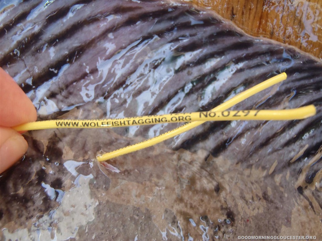 A tagged wolffish is easy to spot—look for the bright yellow streamers just below the dorsal fin.