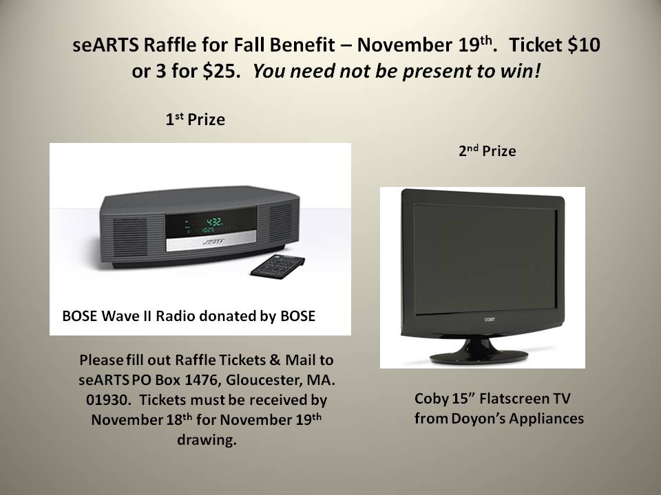 Raffle: Before and during the event you can purchase raffle tickets to win a BOSE Wave II radio and a second prize of a 15″ TV. Tickets are $10 each or 3 for $25. Please contact info@searts.org to purchase in advance!