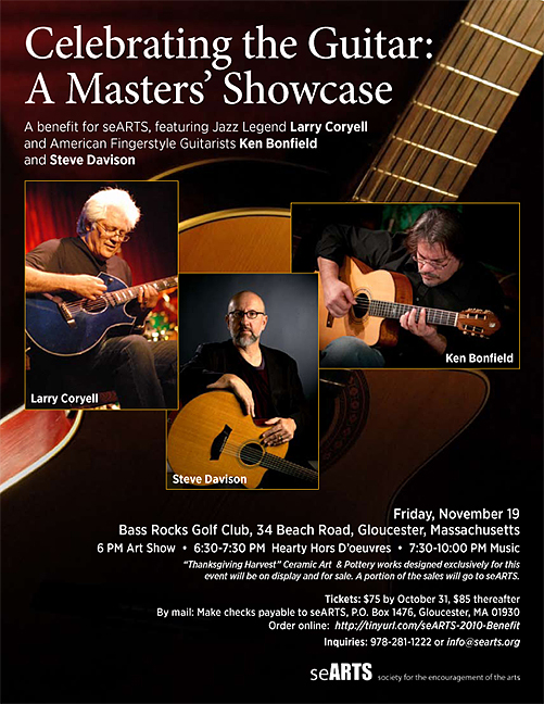 For advance tickets by mail send check to SeArts PO Box 1476 Gloucester, MA. 01930 Music: Celebrating the Guitar: A Masters’ Showcase. Jazz legend Larry Coryell and renowned guitarists Ken Bonfield and Steve Davison will lead an inspiring tour of the world of American fingerstyle guitar in a benefit for the Society for the Encouragement of the Arts. This event will feature country blues, ragtime and folk, traditional Celtic, jazz and classical pieces in an intimate café-style setting, appealing to fingerstyle guitar aficionados and newcomers alike.Visual Art: The Bass Rocks Golf Club is also home to seARTS original “Art Loan Program.” The art on the walls are original works for sale by 24 seARTS artist members. The evening will also feature over a dozen ceramic artists of Cape Ann whose works will be on display and for sale throughout the evening. Ceramic artists who have donated include: Helen Beal, Cynthia Curtis, Nina Goodick, Susan Hershey, Jayne Lacey, Deb Levene, Annie Melancon, Marty Morgan, Sigrid Olsen, Roselle Randazza, Evy Stewart, Virginia Townsend, Twinlight Studios, and Seyrell Williams.