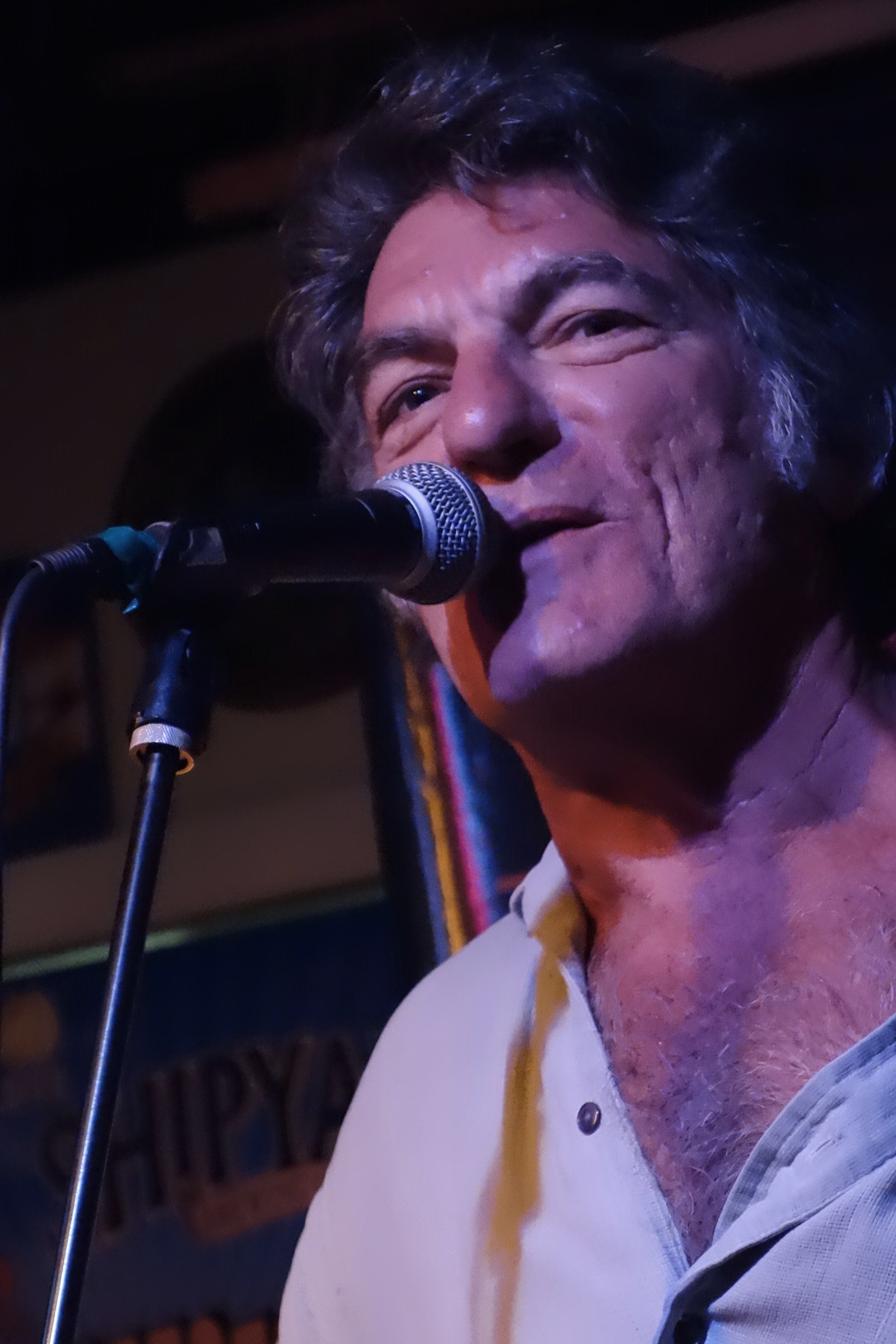 The commodious Steve Sadler, everybody’s favorite musical paint box, provides smooth backup on guitar, as does Mr. Chris Rivelli, former Broomful ‘o Blooze drummambulist and sneezeguard. I’ve been practicing all week!