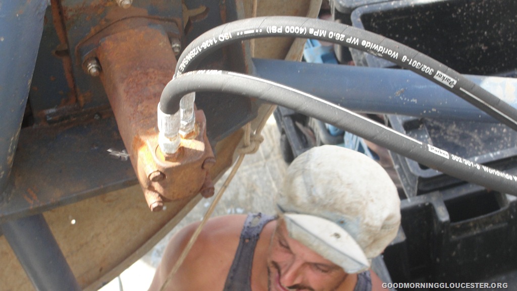 Behind Stoga is a high tech gillnet hauler.  It is made by a company in the UK named Spencer Carter.  It is the first of it’s kind that I’ve seen in Gloucester.   Mike Leary, the boat’s owner tells me that there are only 3 moving parts to this gillnet hauler as opposed to 175 on the traditional haulers used by the Gloucester fleet.  There was a guy who worked on the traditional gillnet haulers out of New Bedford but Mike also tells me he closed up shop.