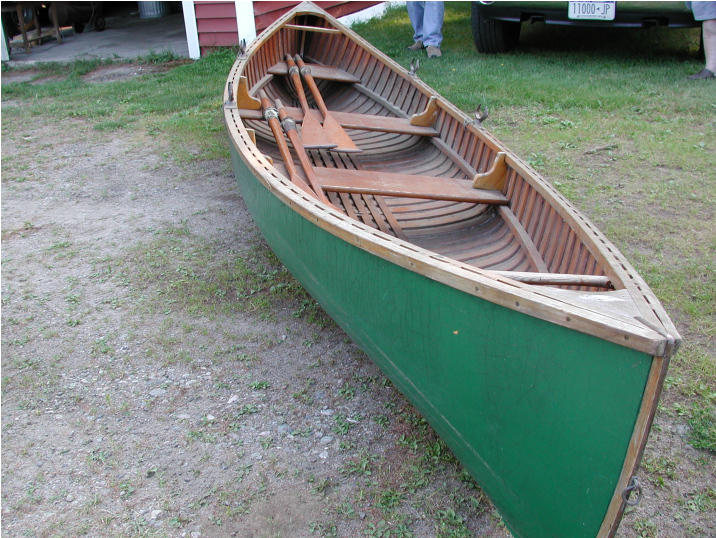 Old Town rowing canoes were built in Old Town, ME from the end of the 19th century to the first few decades of the 20th century, and ranged from 15 to 20 feet in length. (Ours were 15-footers). They were built like canoes, thin cedar planks clench-nailed to flat split ash ribs, covered with canvas and painted dark green. They had bronze oarlocks and elegant spoon-bladed oars. They were heavy, but made to slide through the water with ease.