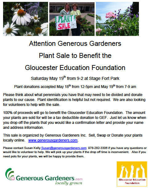 Last year the sale produced over $2,000 for the Gloucester Education Foundation (GEF), a nonprofit organization dedicated to making Gloucester one of the five best school districts in Massachusetts. For more info contact susan@generousgardeners.com