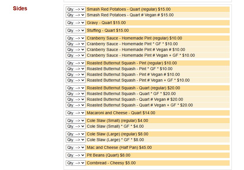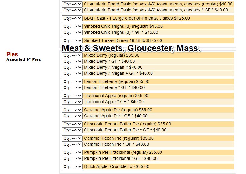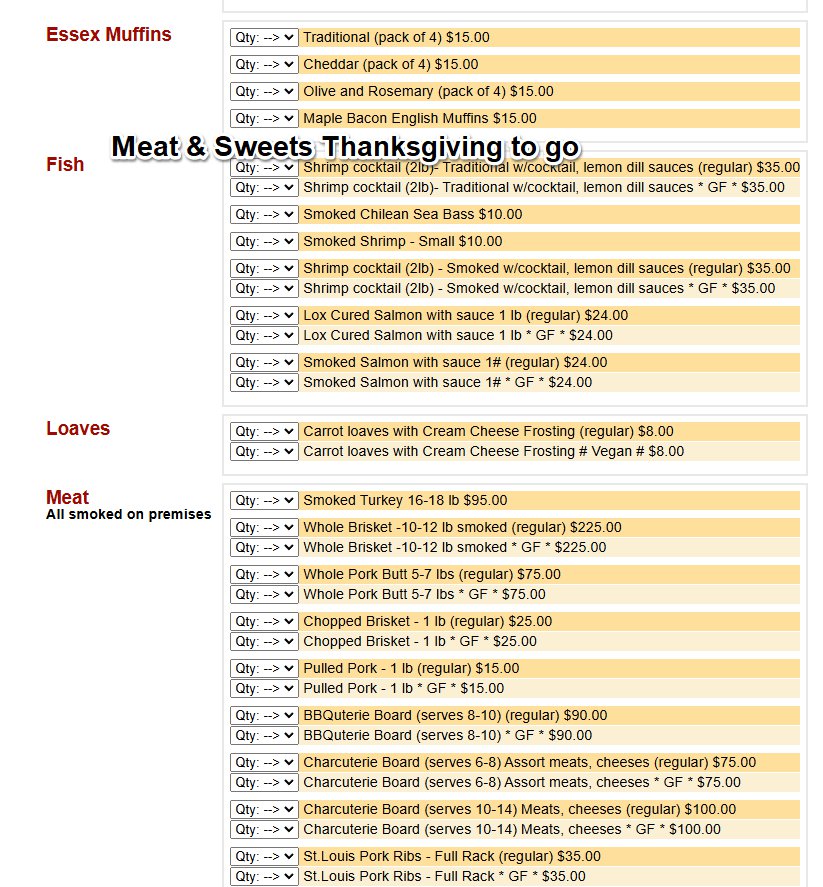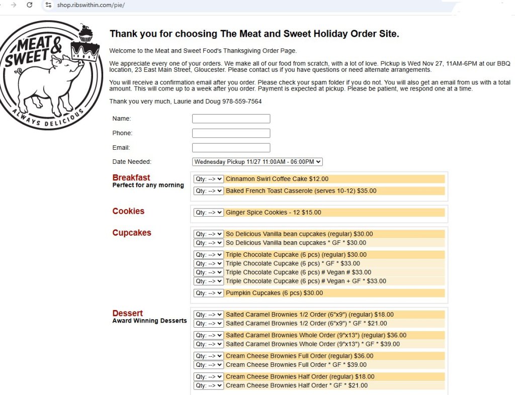 Welcome to the Meat and Sweet Food’s Thanksgiving Order Page. We appreciate every one of your orders. We make all of our food from scratch, with a lot of love. Pickup is Wed Nov 27, 11AM-6PM at our BBQ location, 23 East Main Street, Gloucester. Please contact us if you have questions or need alternate arrangements. You will receive a confirmation email after you order. Please check your spam folder if you do not. You will also get an email from us with a total amount. This will come up to a week after you order. Payment is expected at pickup. Please be patient, we respond one at a time.
