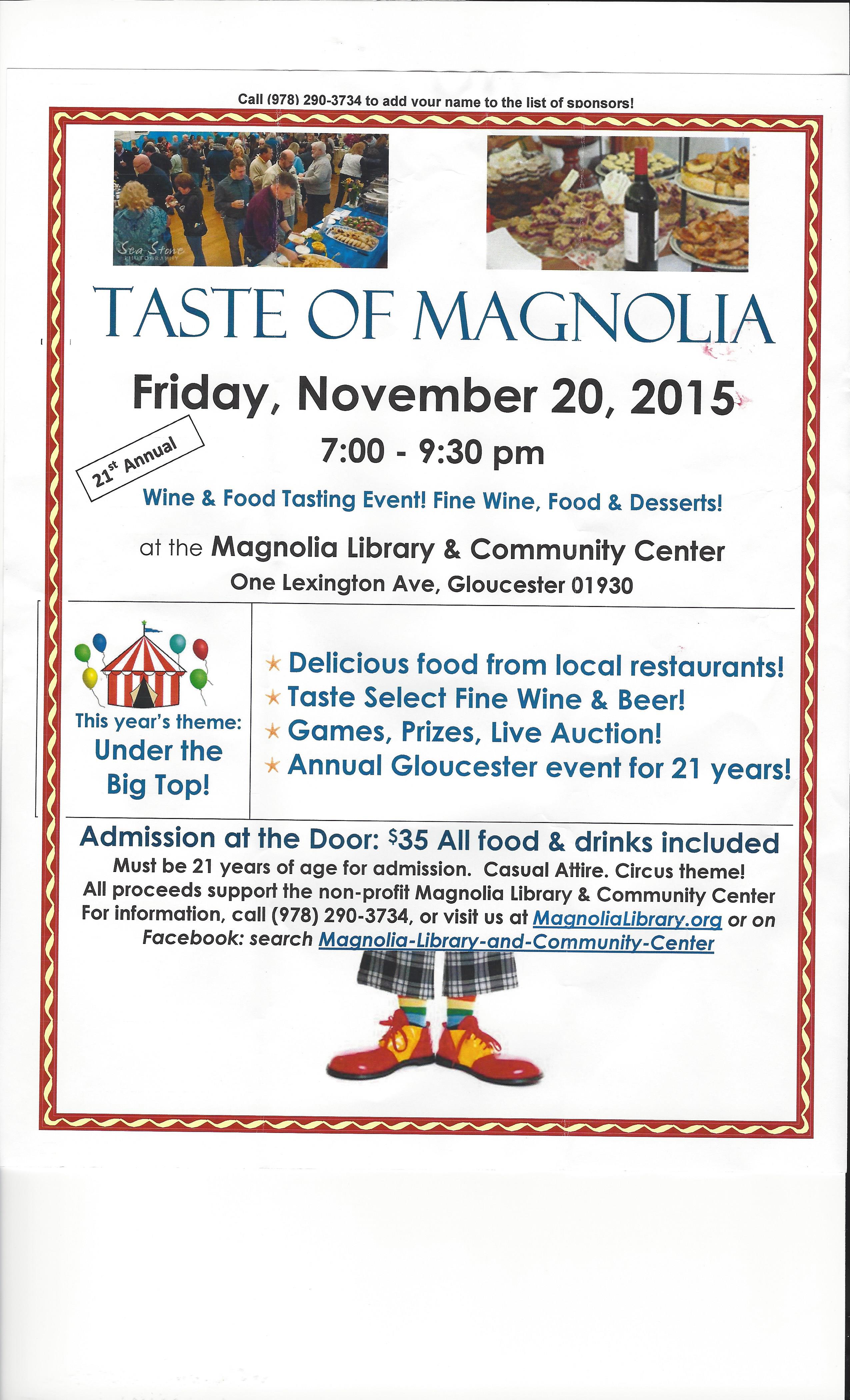 The Magnolia Library Center has been and integral part of the Gloucester community for over 100 years. The Center provides a multitude of services including a foundation for community events, a meeting place for organizations, a site for local and national elections, civic and social educational events, the first responder meeting place in time of community need, a sporting area, a rental space for parties, social events and fundraisers, is also encompasses a library and the Magnolia Historical Museum. The Magnolia Library Center is a non-profit has been self-sufficient since 1969. Money to keep the Center thriving is rasied through events planned and executed by a volunteer Board of Directors and its supporters. The 15th Annual Taste of Magnolia fundraising event will take place on February 26th, 2010. Many local restaurants will present their provisions along with their choice of wine and beer. This event raises money through ticket sales, raffle tickets and a silent auction.