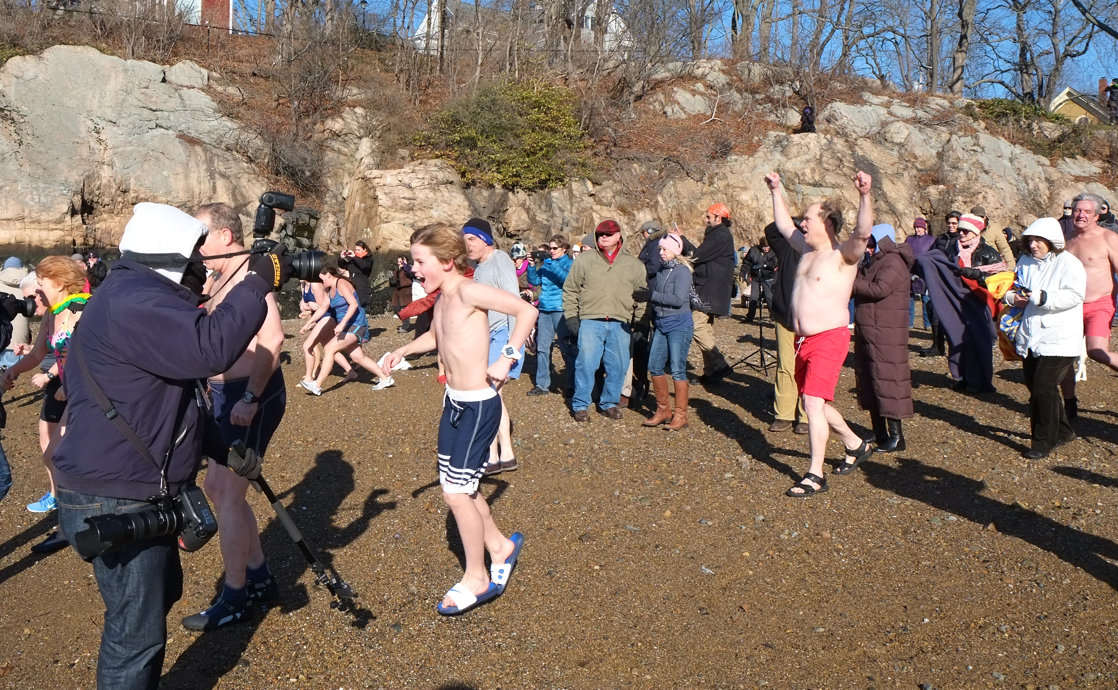 With below average temperature and wicked wind, the 2015 Rocky Neck Polar Plunge Open Door Food Pantry Fundraiser was a plunge to remember. Dru, pictured above and below, reports that it wasn’t too bad running towards, or even diving in. The worst was running back to the beach against the bitter biting blast that had picked up during the event, and the fact that he couldn’t feel his feet!