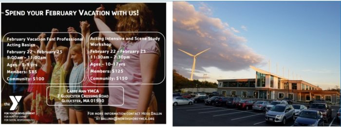 “It is official. We have a terrific schedule of February Vacation Acting, Scene Study and Performance Classes for ALL ages at the Cape Ann YMCA! Classes are divided by age. We have a class for 5 to 9 year olds and a class for 10 to 17 year olds.”