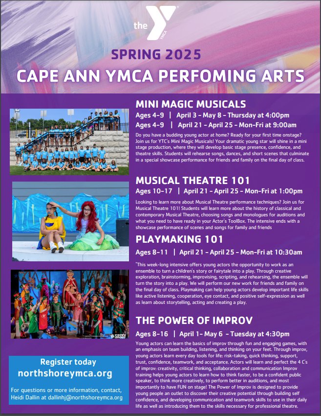 “It’s going to be a fun week! Come to the Cape Ann YMCA where you can be in a play, write a play, learn about acting and singing and be a part of a musical theatre production! Register here. “