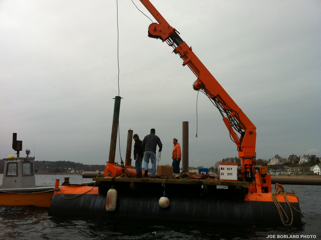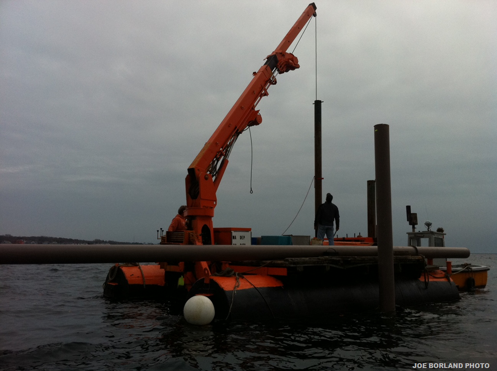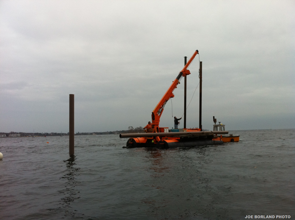 The pile-driving crew just drove in a test piling and located the anchor points before the wind picked up and they had to stop. The pilings will be driven into the mud 10 feet and pounded in another (roughly) 2 feet before it’s all said and done. Work will resume again on Black Friday, if there are calm winds. All work will be done at high tide in a four-hour window. They will drive in 6 poles and then make a platform that attaches at the top.