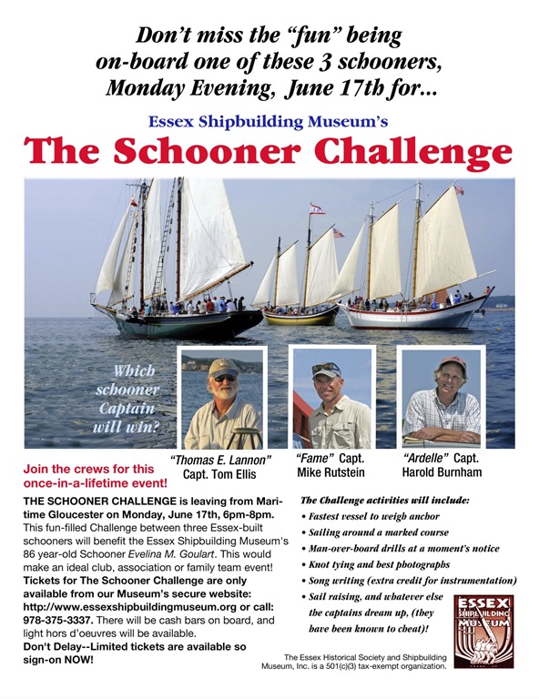 Tickets for The Schooner Challenge are $40 ea. and are only available from our Museum’s secure web site: http://www.essexshipbuildingmuseum.org/details-of-our-next-events-27.html#SchoonerChallenge