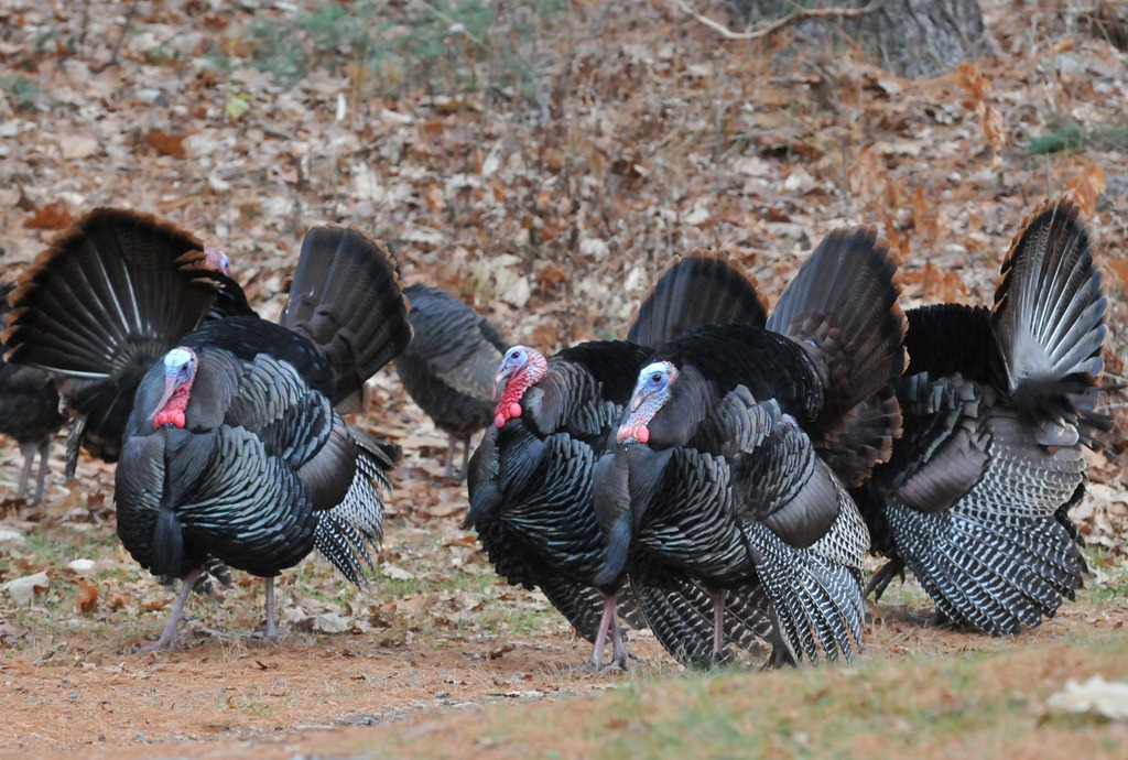 Turkey running down the road and trying to find a place to cross in the drifting snow.