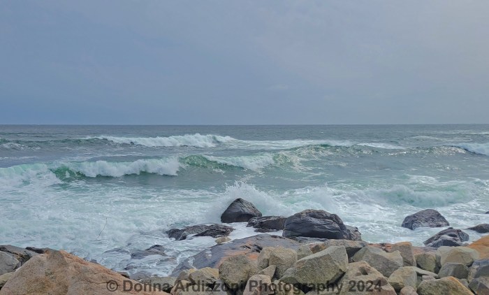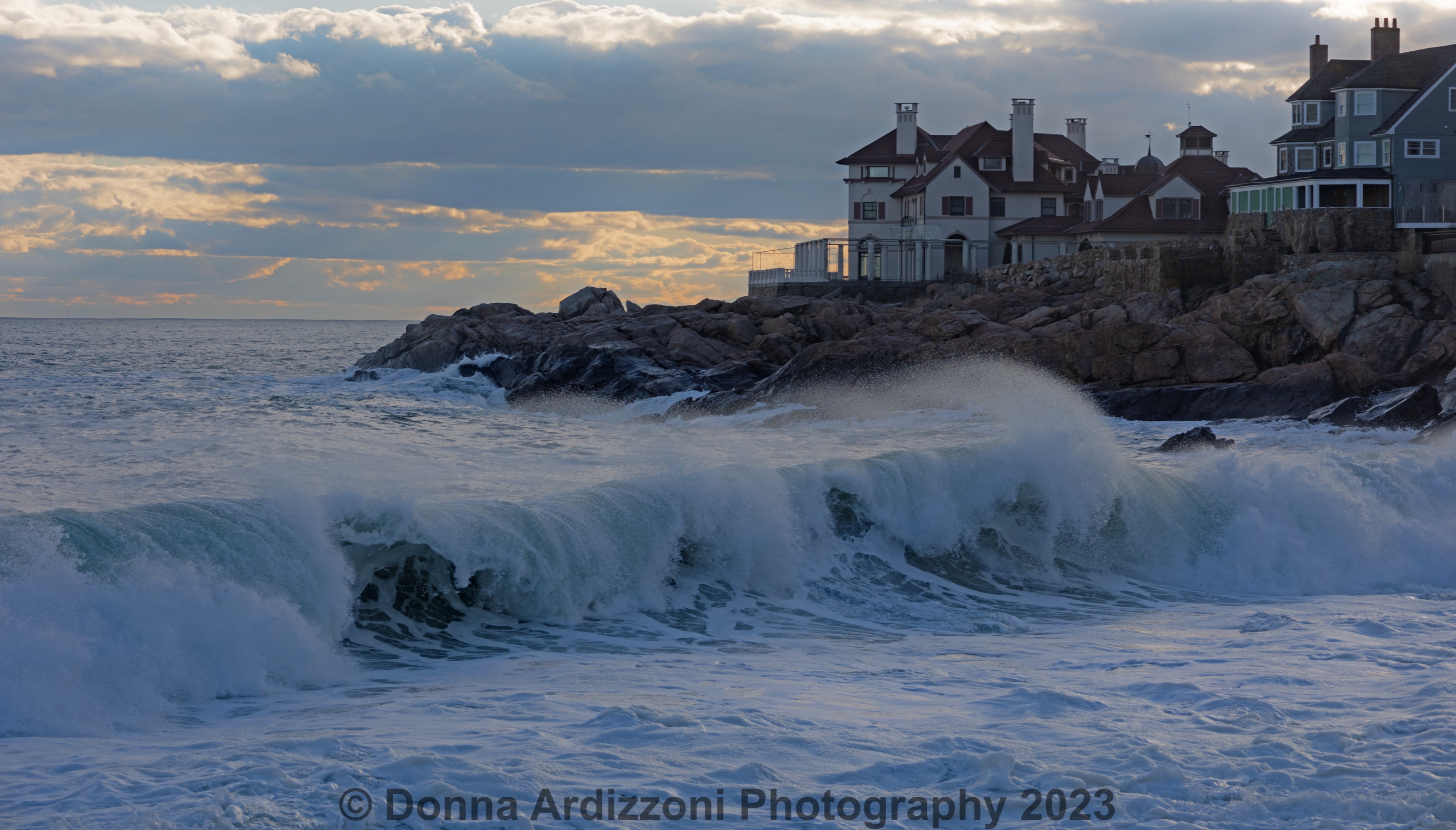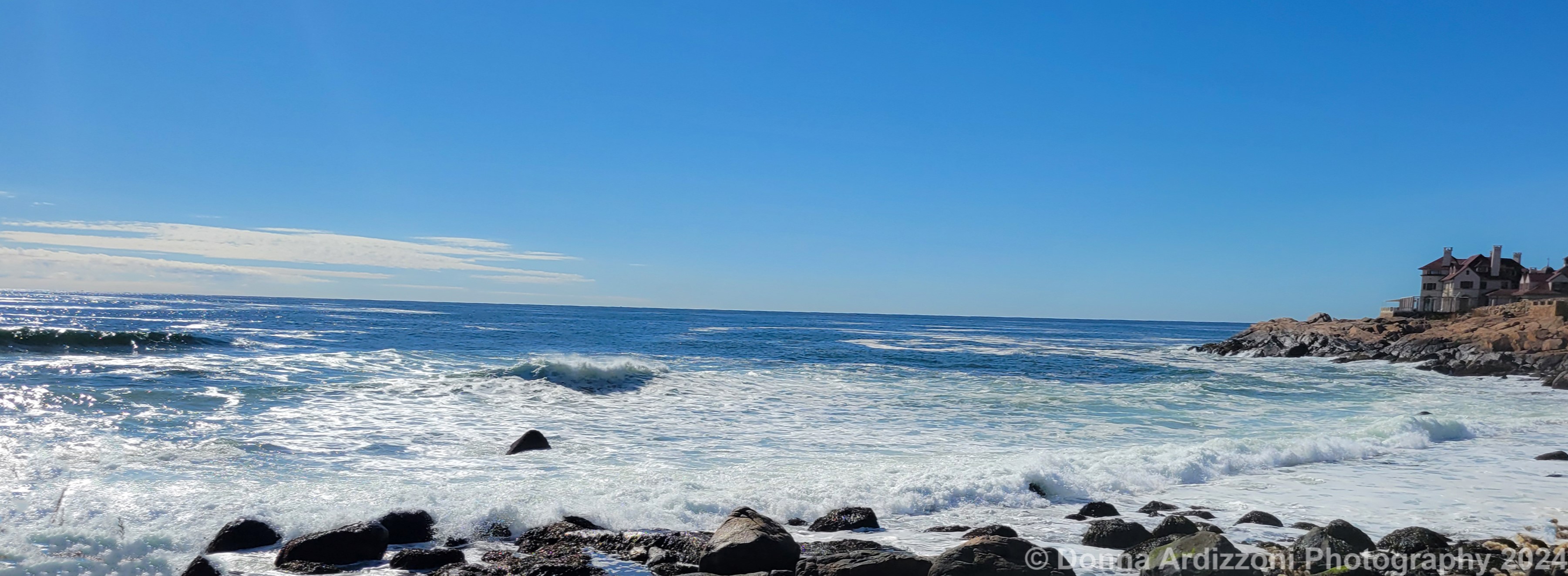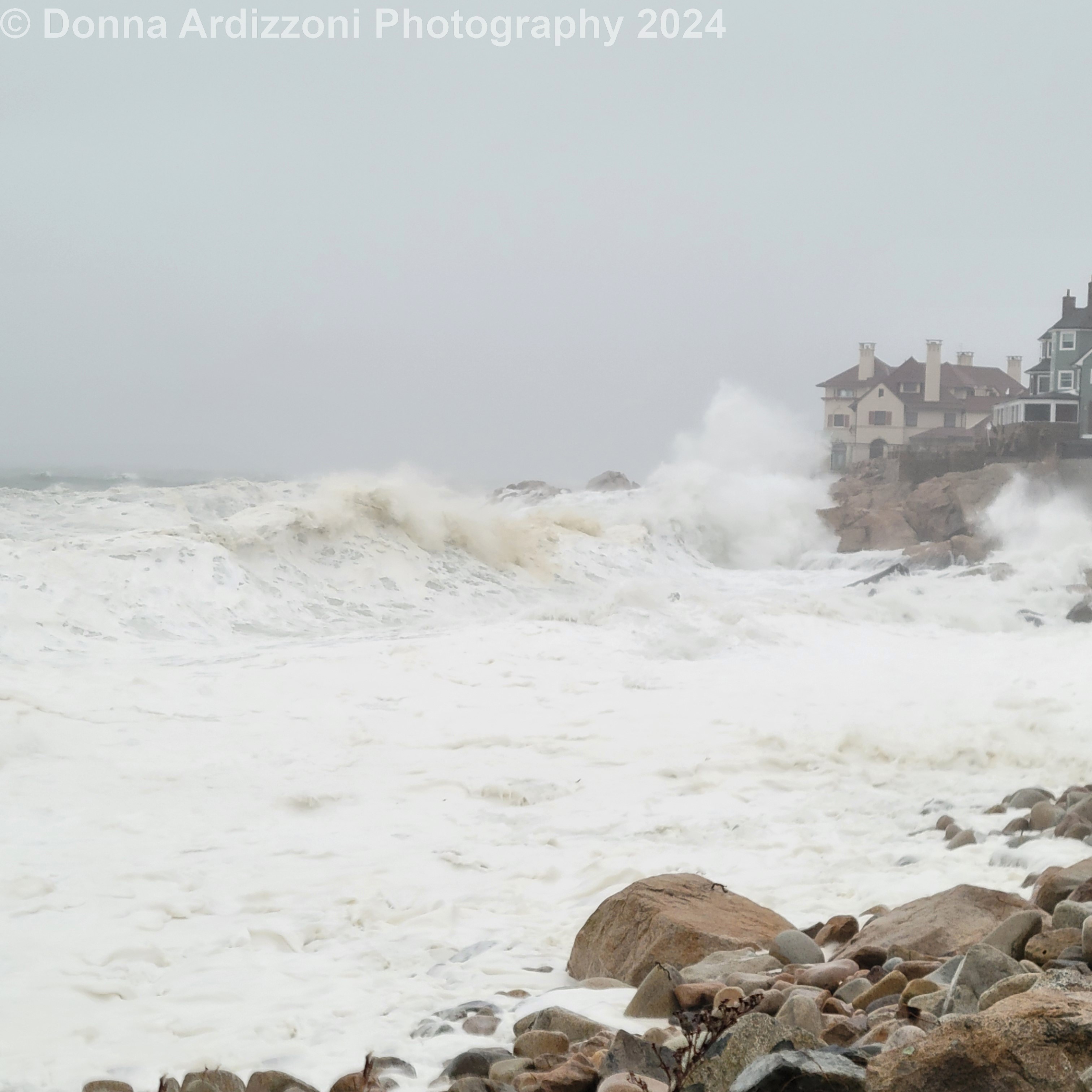 photo caption: 3/10/2024 at about high tide, views from Gloucester and Rockport, Long Beach, Twin Lights. Before the sun came out, the wind was strong enough this morning to move a portapotty off site 100′ down a street. Later, when the sun broke, waves in the surf matched up with a cloud filled blue sky.