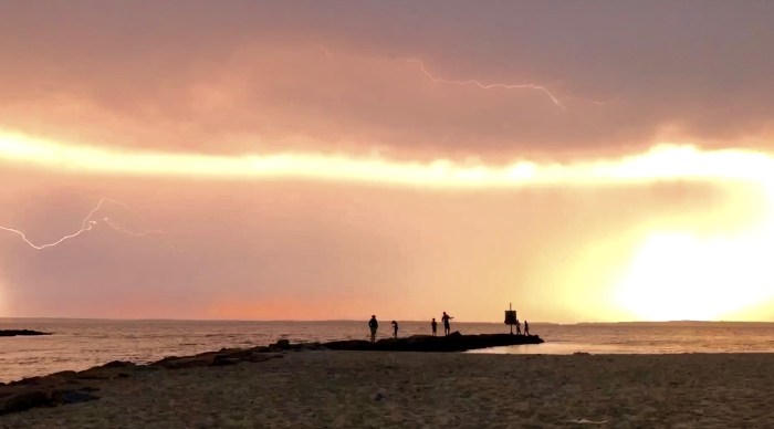 We drove down a long and narrow dirt road to get to Lake Tashmoo Beach near Vineyard Haven on Monday night so that Finn and my nephew could fish while my mom, sister, and I enjoyed some drinks and a picnic on the beach for the sunset. The sky was overcast…but it still did not disappoint. Both boys are in their element while casting no matter what the conditions. As they walked out onto the jetty, the skies changed and the lighting started to strike. They were in no rush to leave… but we made them anyway.